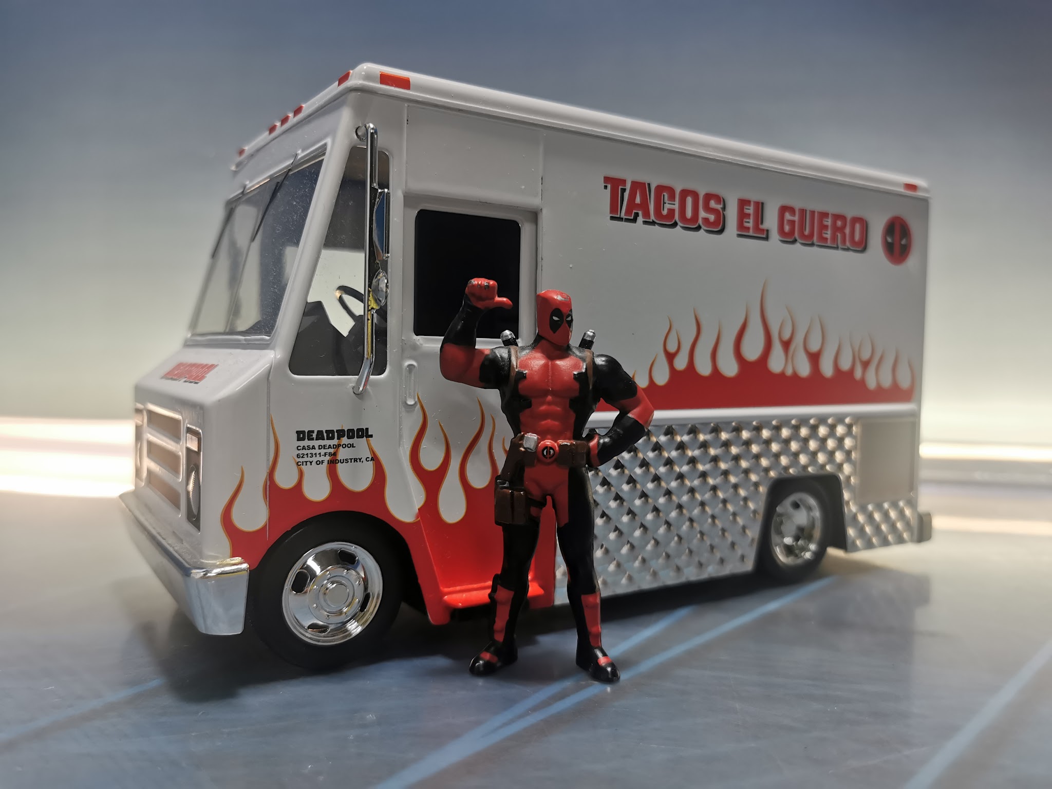 Aqui tenemos a la Replica de la Furgoneta Taco Truck con figura de Deadpool del fabricante Jada Toys – Mdc- Marvel – Deadpool Camión De Tacos El Güero