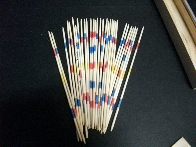 Los palillos son de colores comunes: rojo, verde, amarillo y azul, y de todos los palillos, sólo uno de ellos es de color negro, o en algunos casos blanco. El palito negro (o blanco) es único e importante en el juego. Los otros palillos de colores son de cantidades variadas, y tienen valores de puntuación distintos según su color, siendo el de más valor el palillo único.