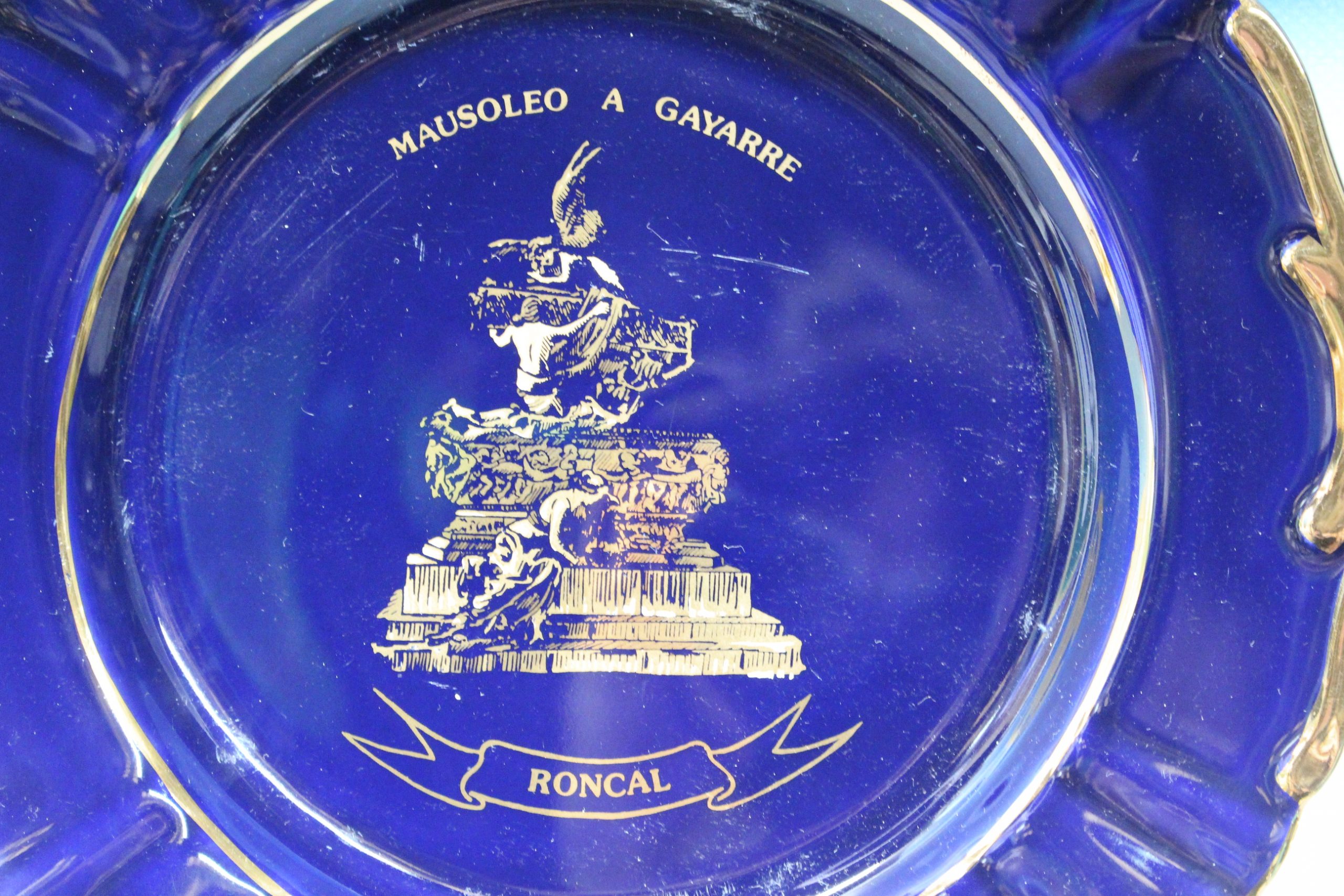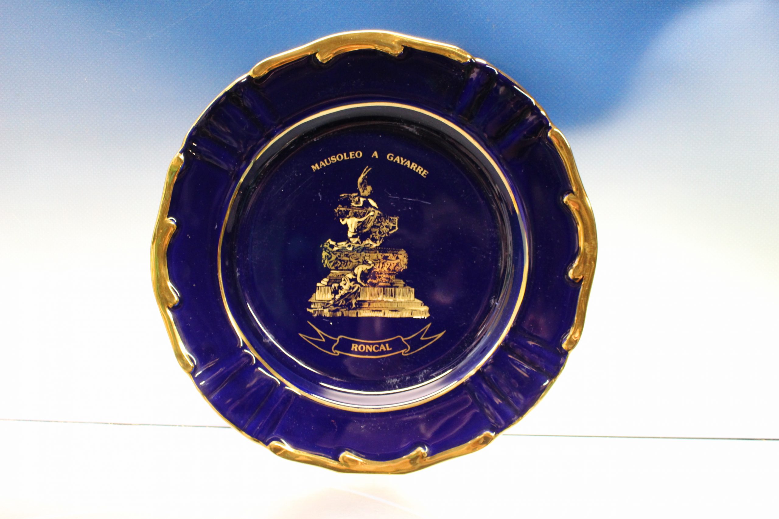Plato decorativo de porcelana azul cobalto y oro.
