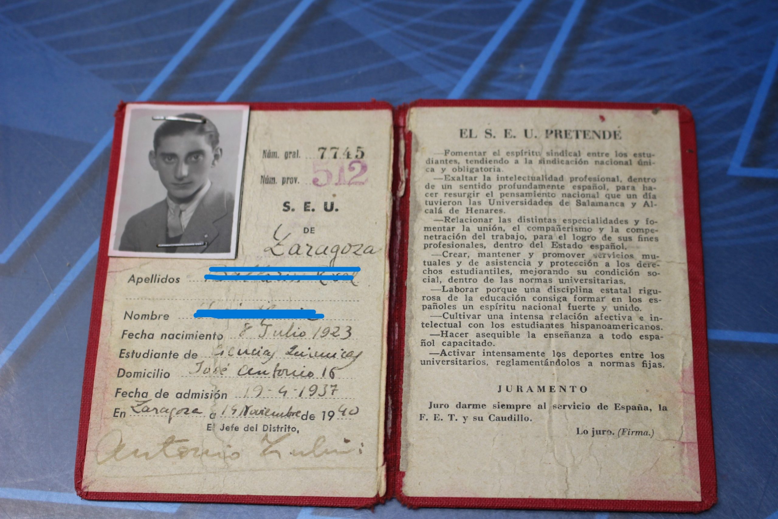 Sindicato Español Universitario. Carnet de 1940.