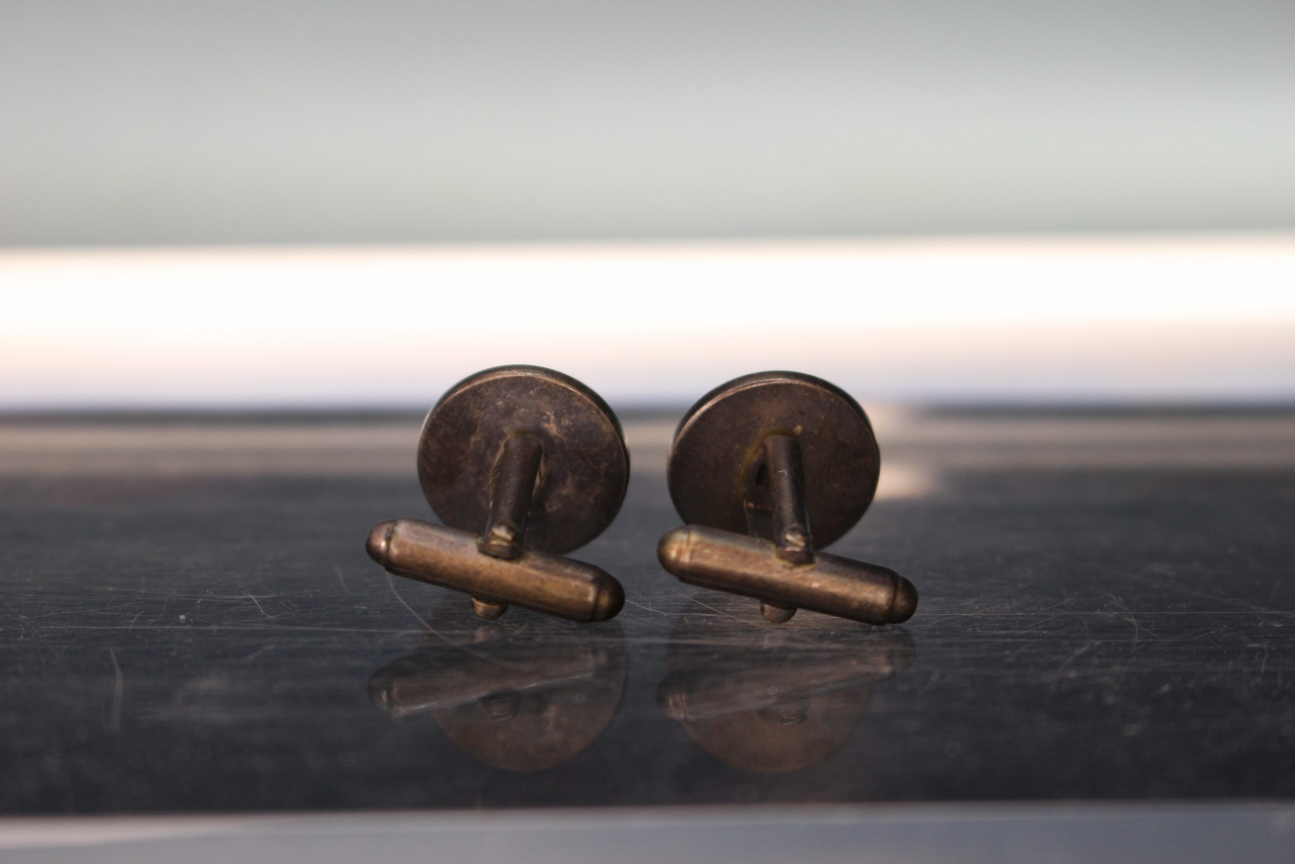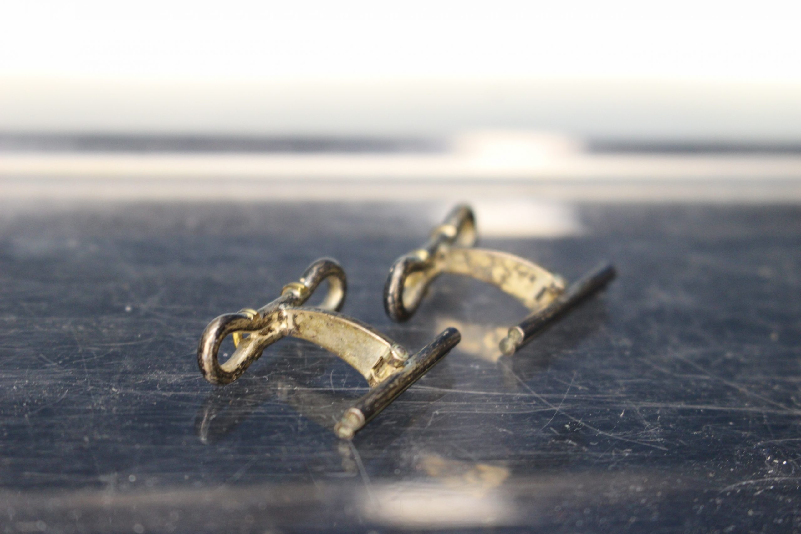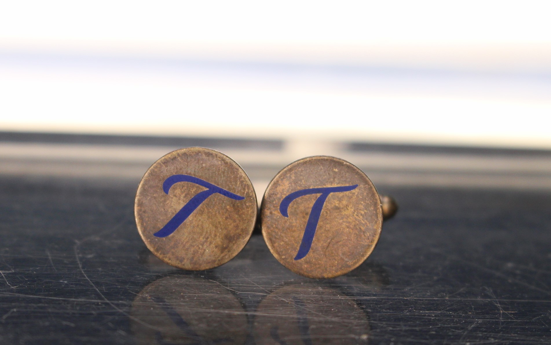 Gemelos antiguos 01. Metal con letra T en esmalte azul.