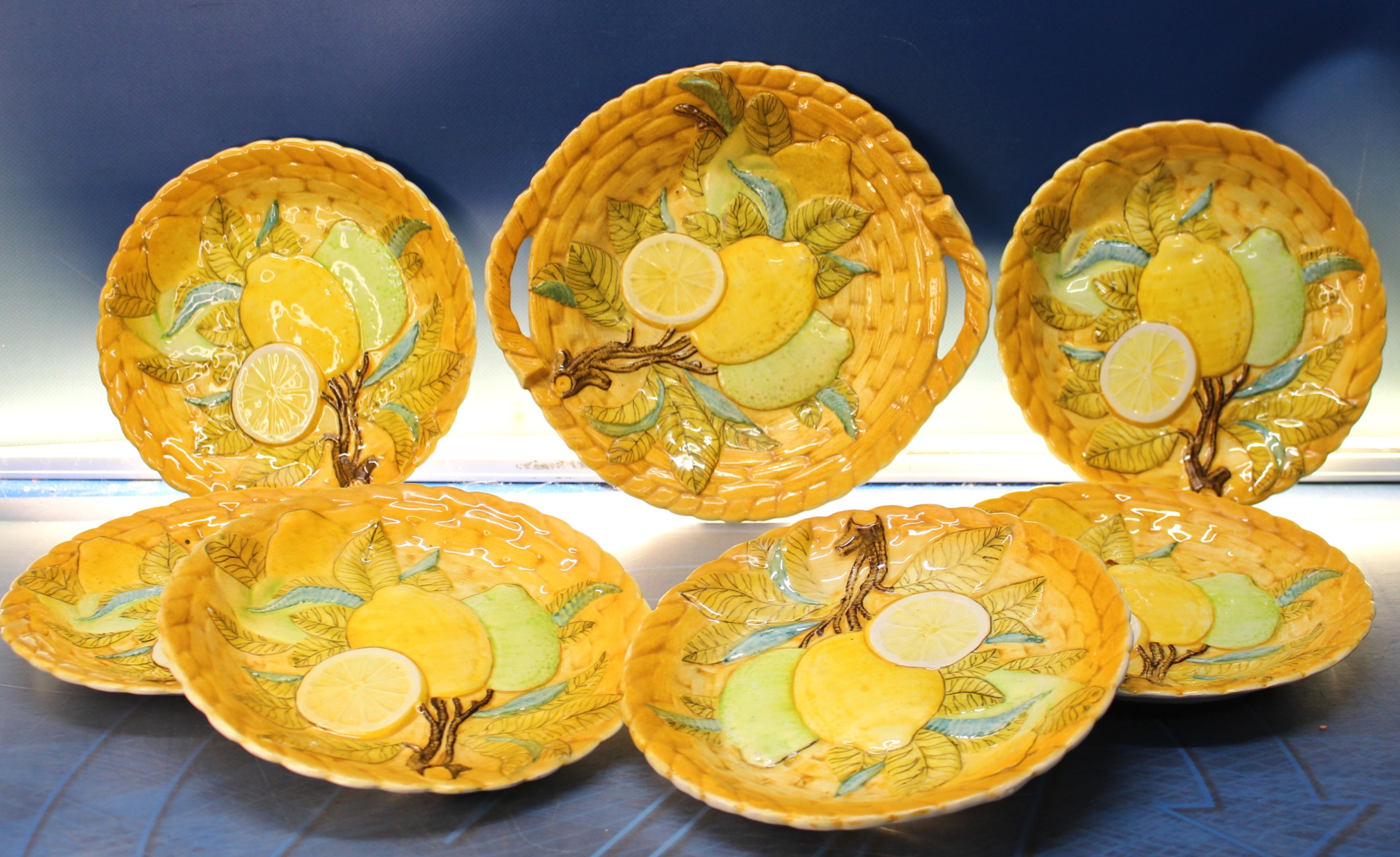 Fuente y 6 platos cerámica Hispania. Limones en cesta. Vintage.