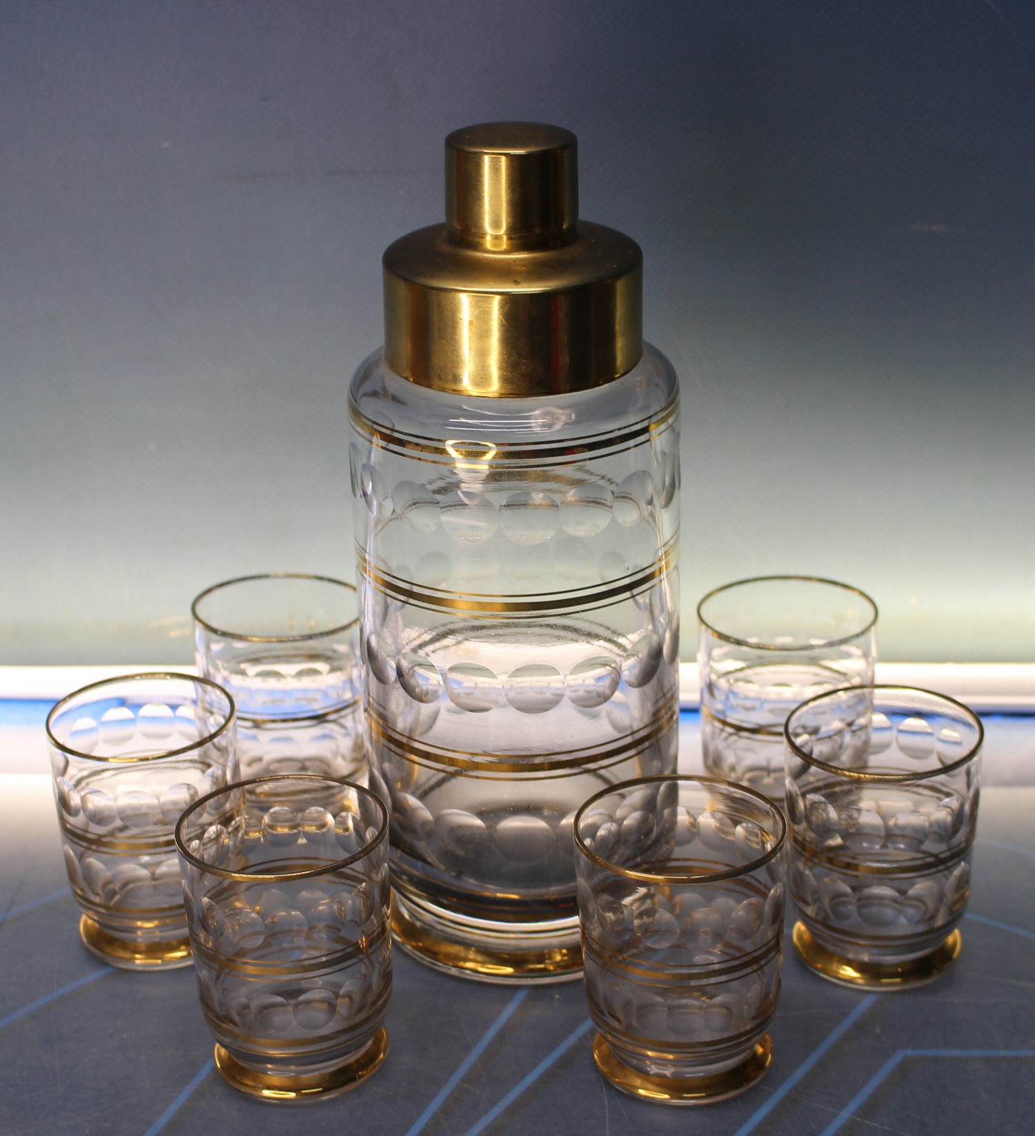 Coctelera y 6 vasos de cristal tallado y metal dorado. Antigua. Art decó.