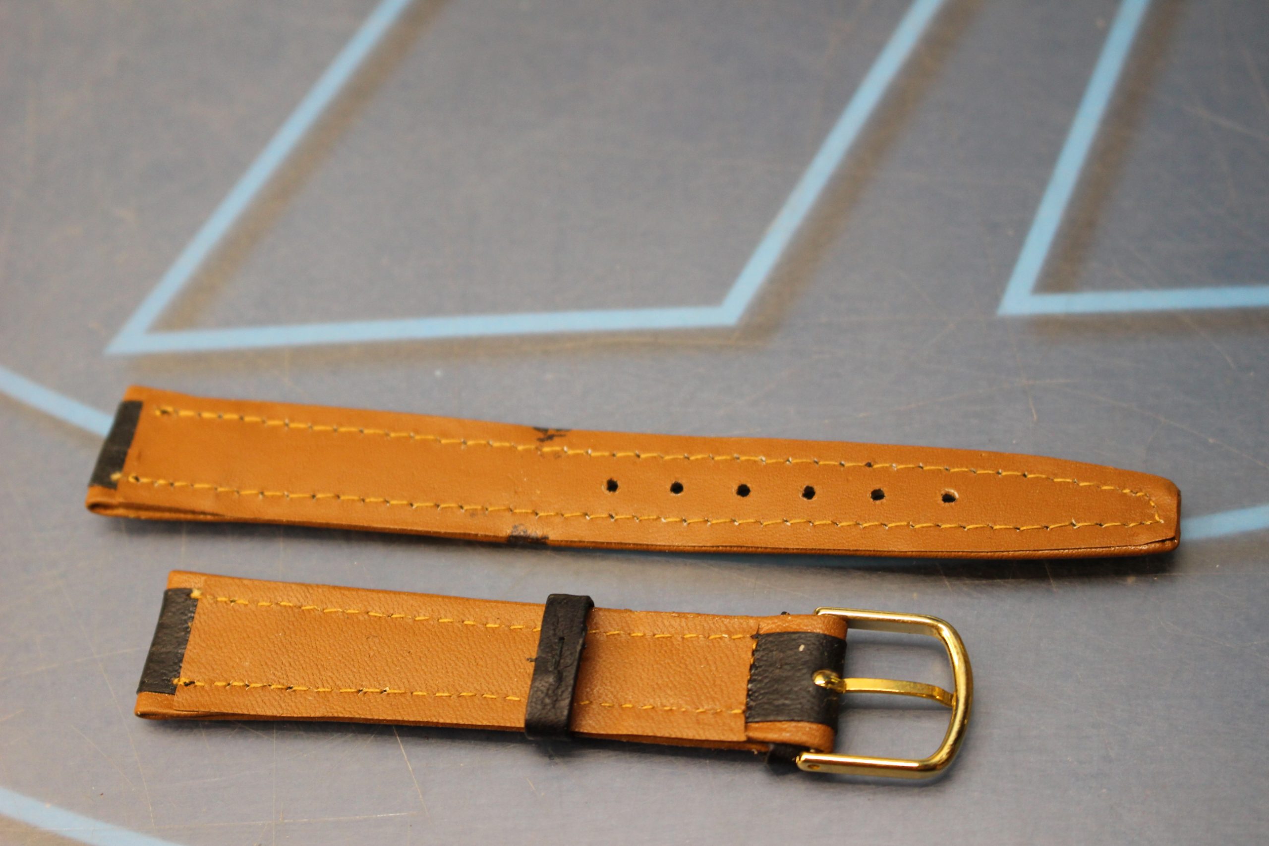 15. Correa de cuero bicolor, negro y marrón. 16 mm. Años 70, stock de relojería.