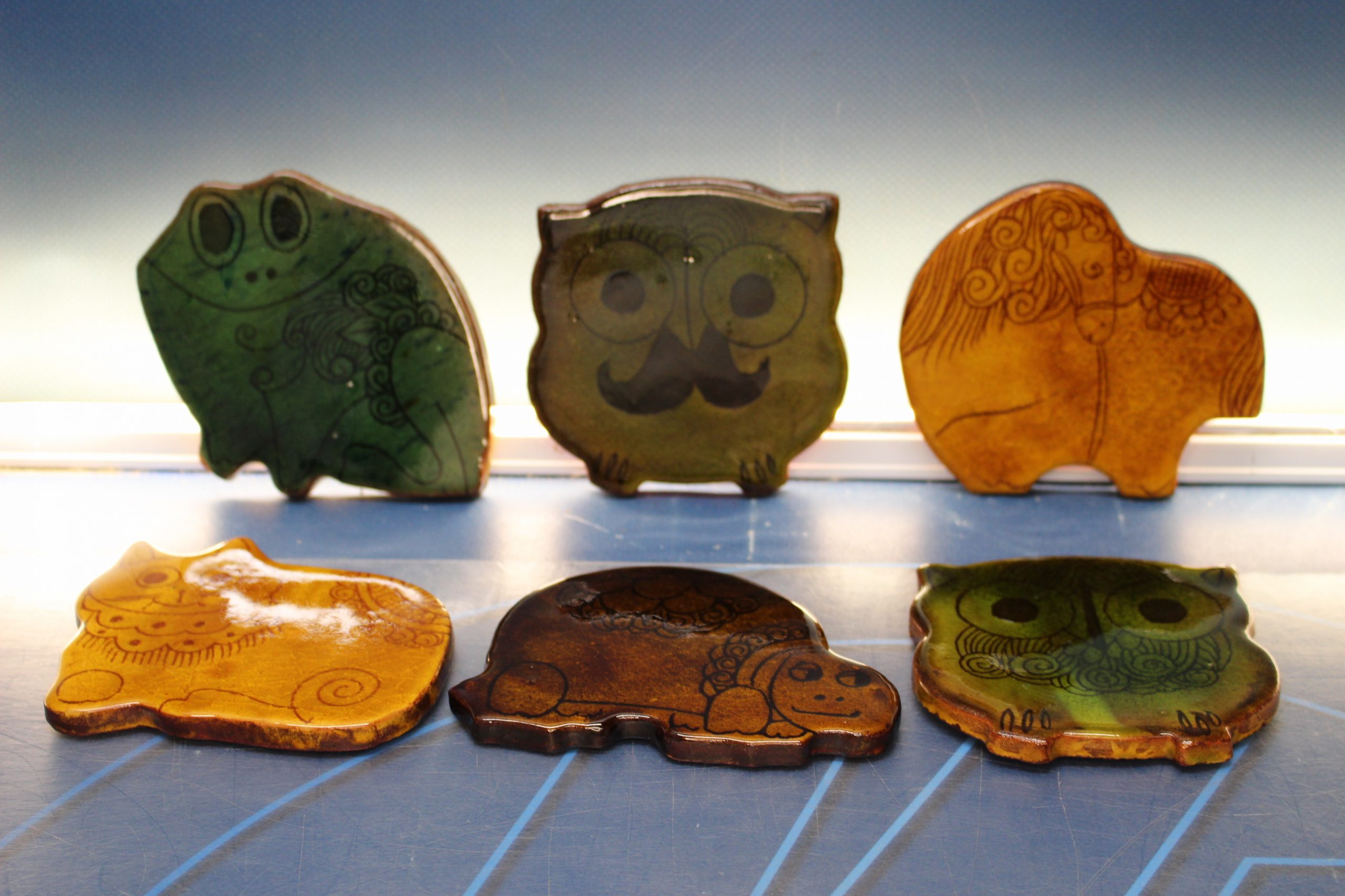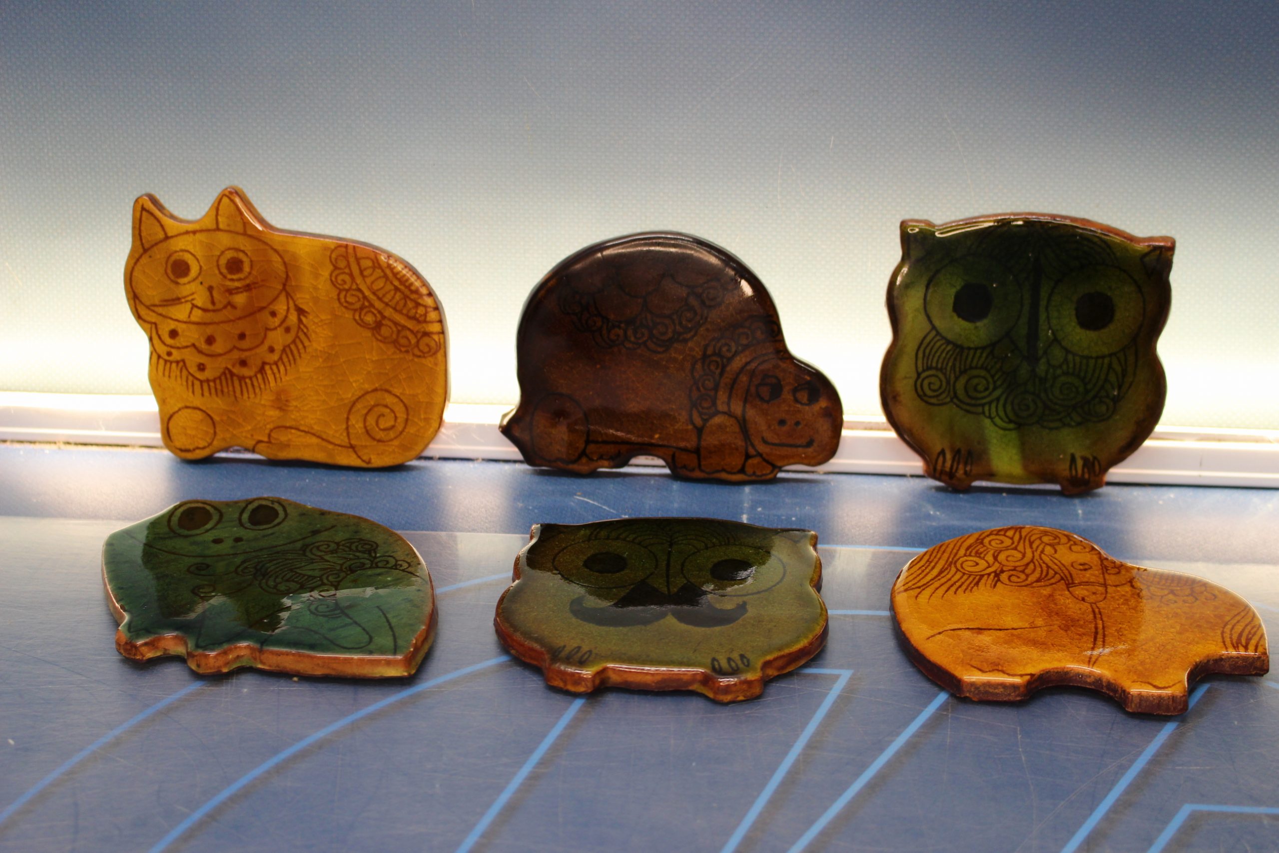6 Preciosos posavasos de cerámica vidriada. Animalitos. Años 60.