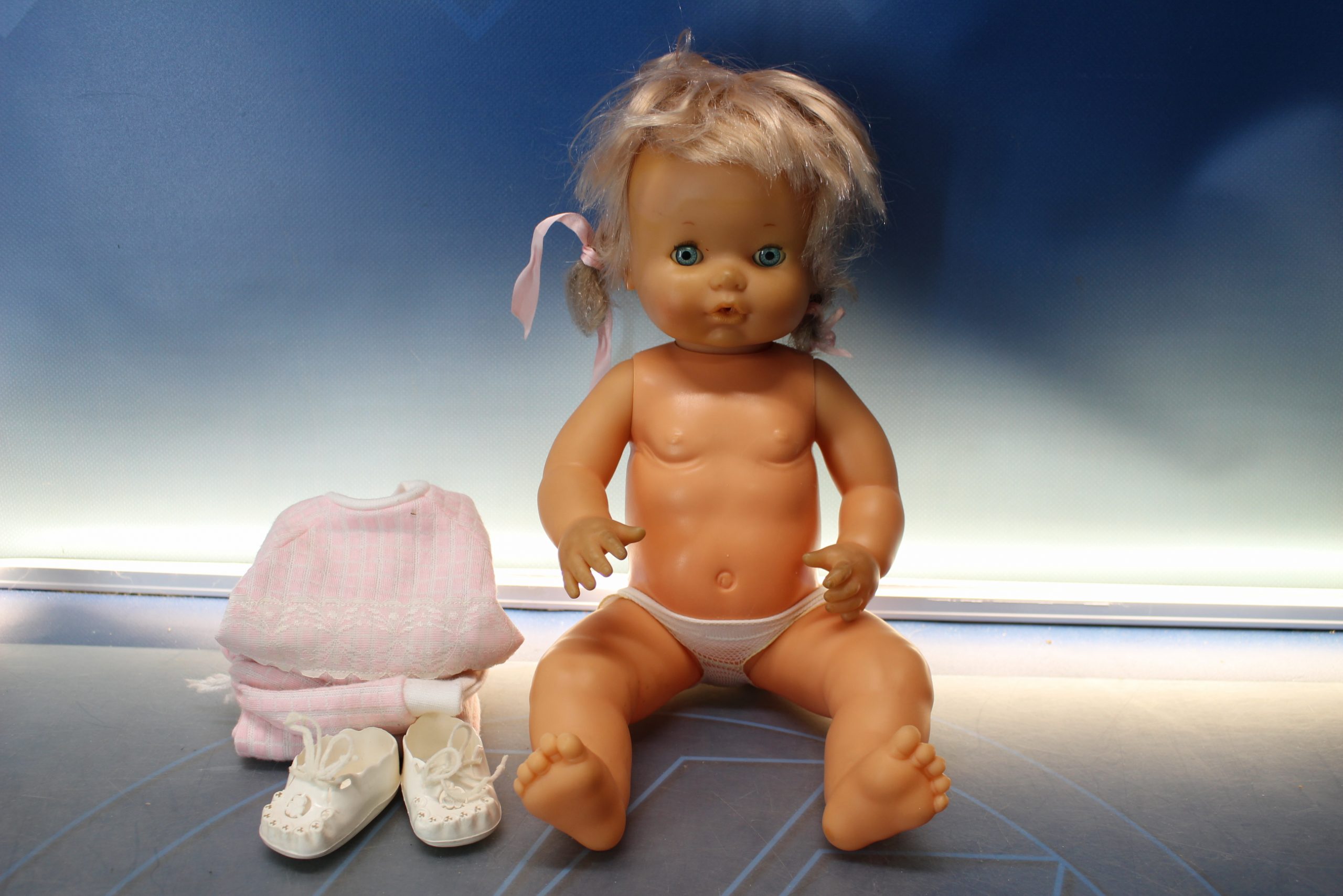 38 cm, brazos y piernas blanditos, 20 dedos en total.
