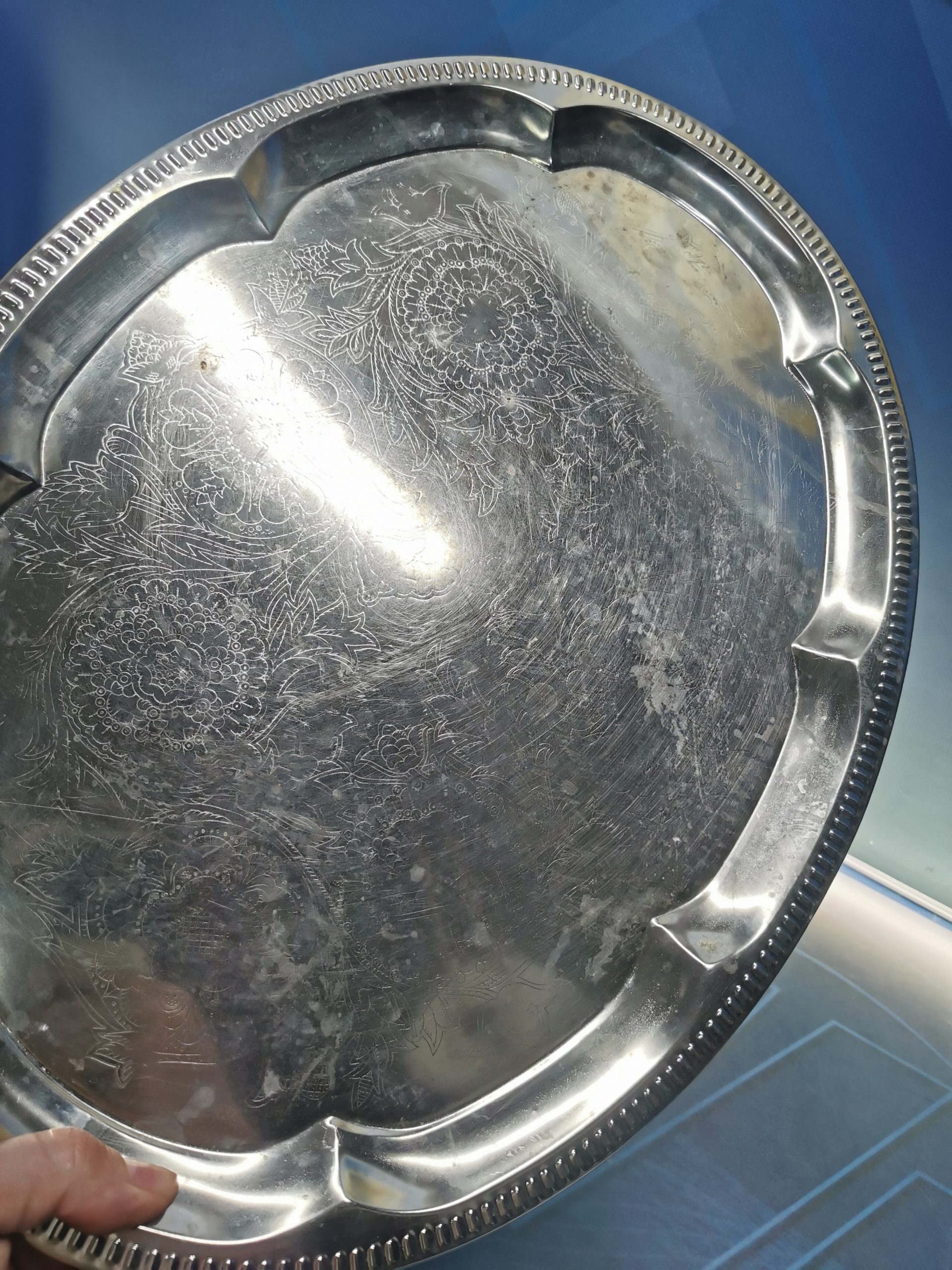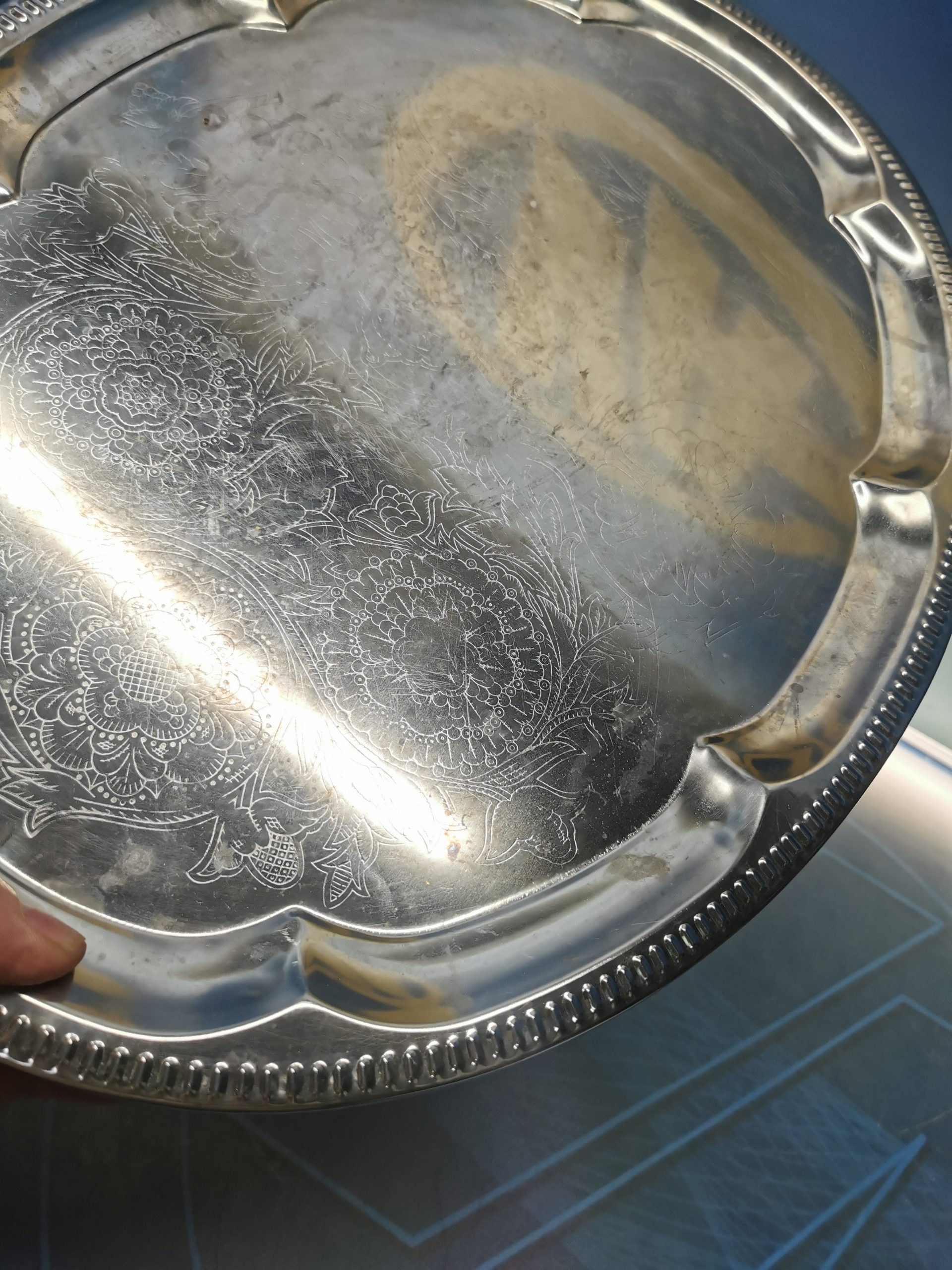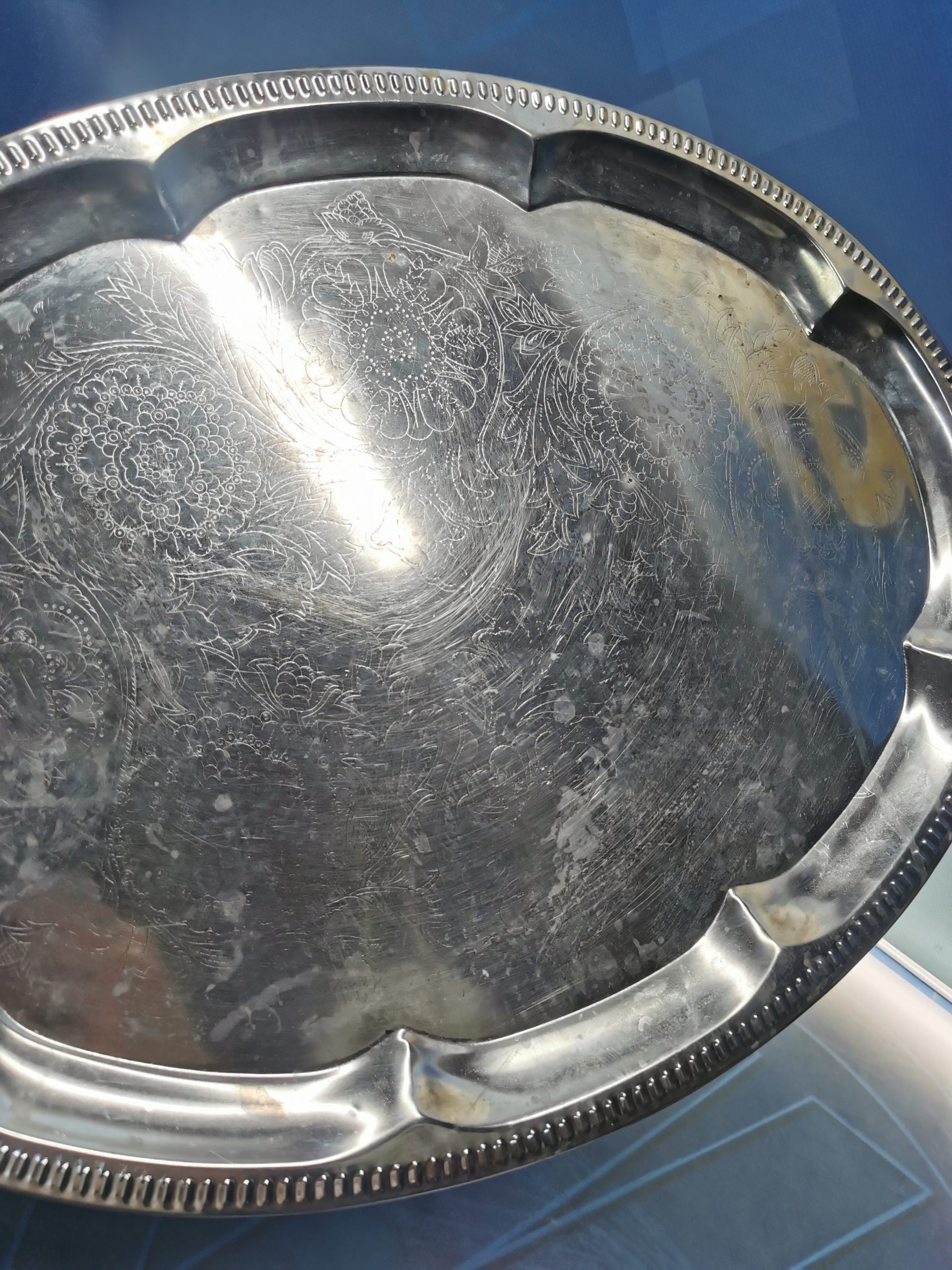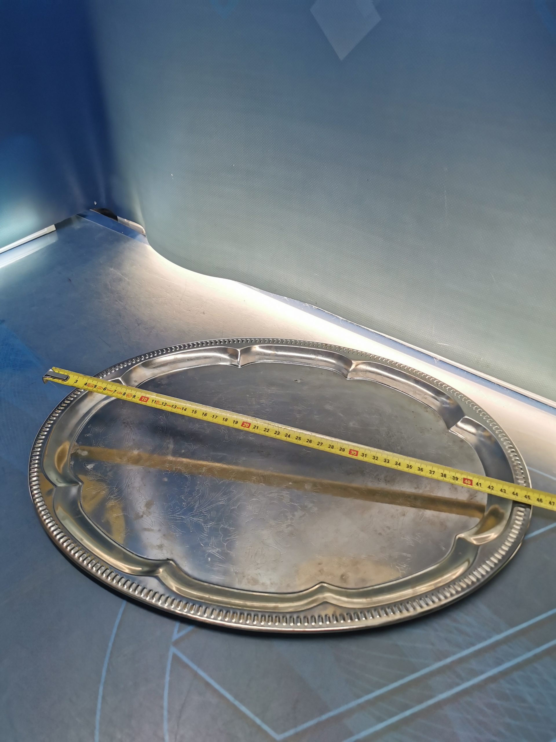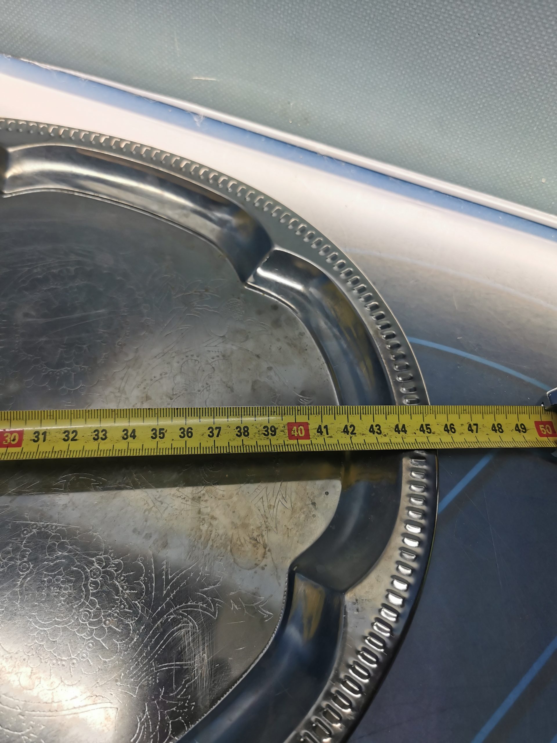 Bandeja de aluminio u otro metal, con detalle borde labrado. 46×34 cm.