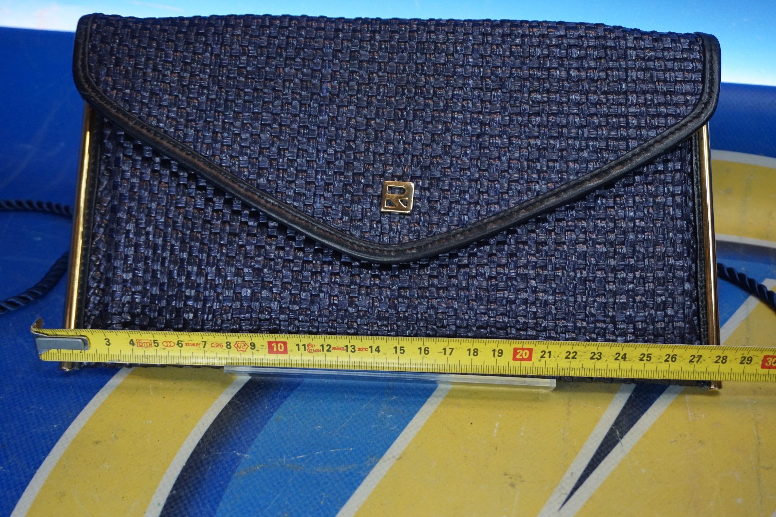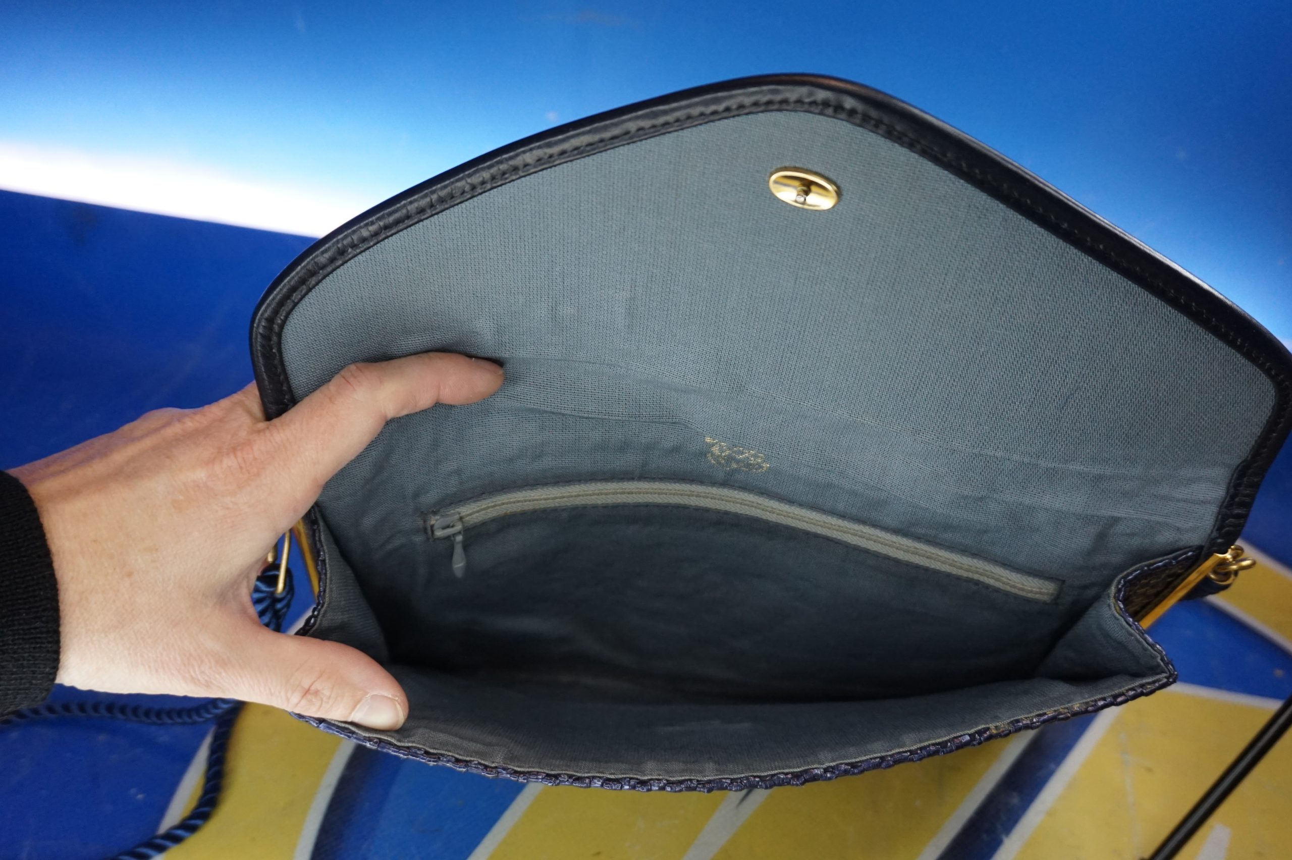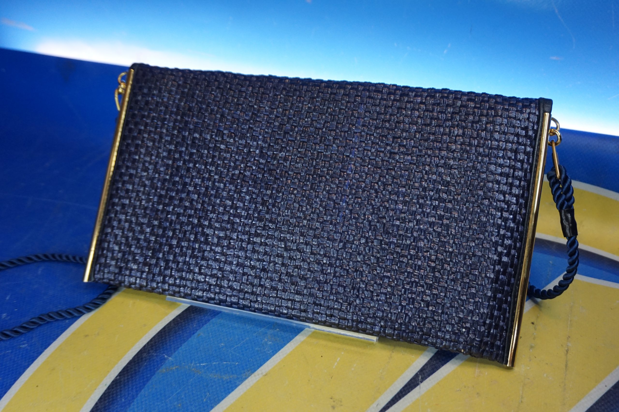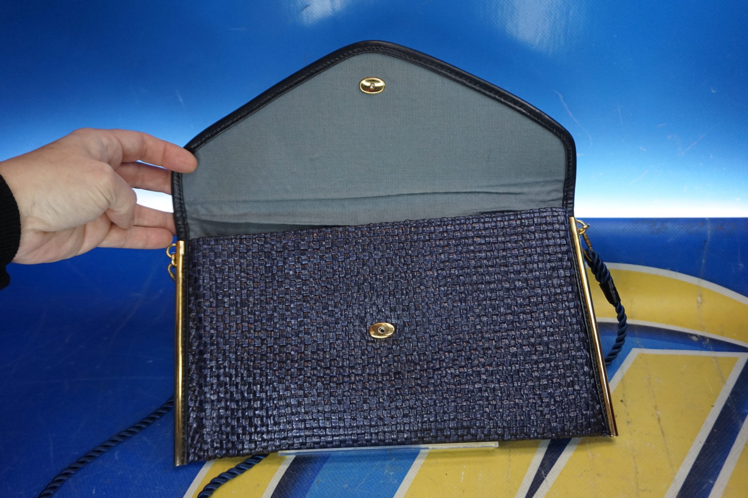 Bolso de mano en rafia tono azul petróleo y dorado con remates metálicos dorados.