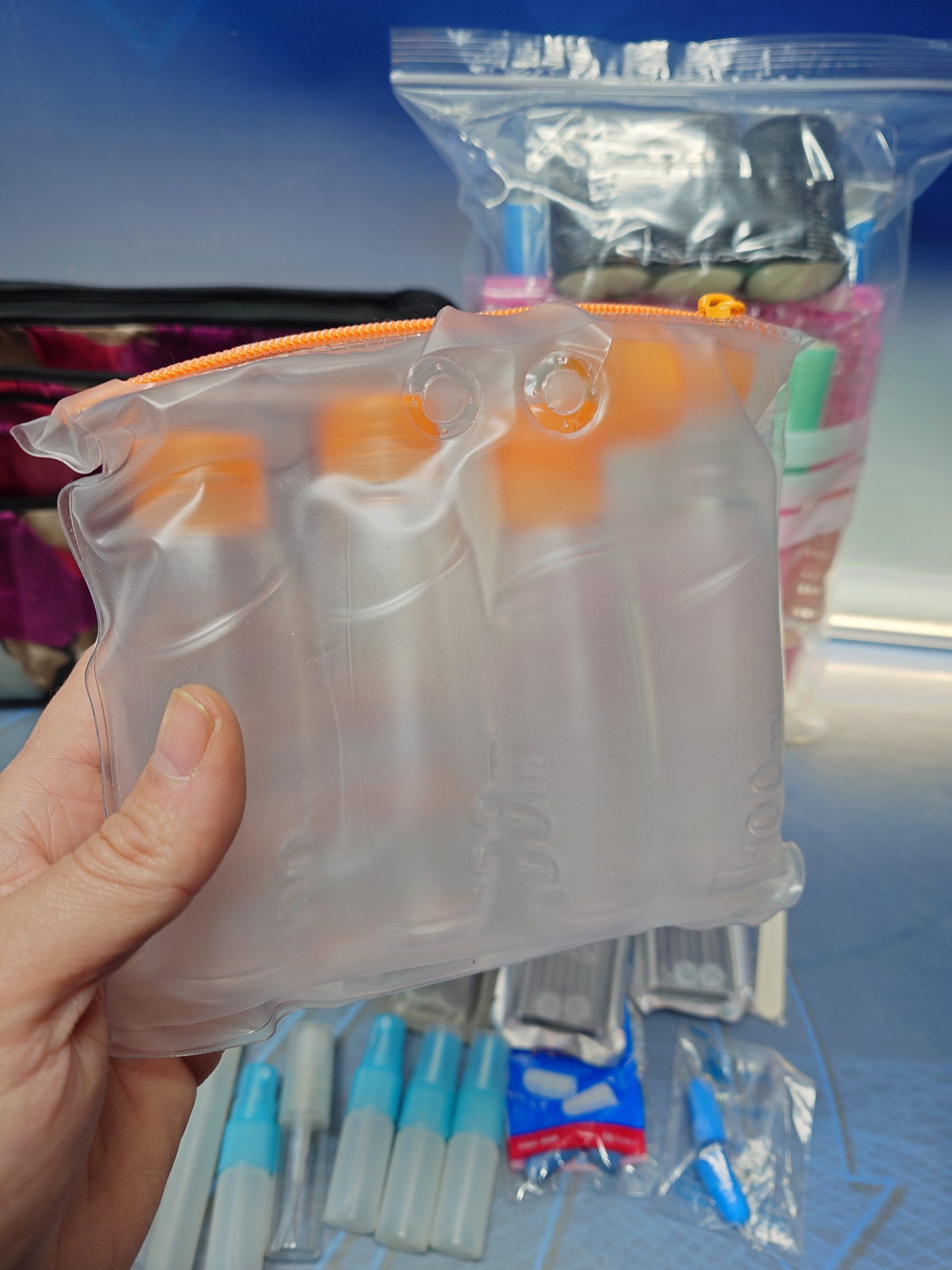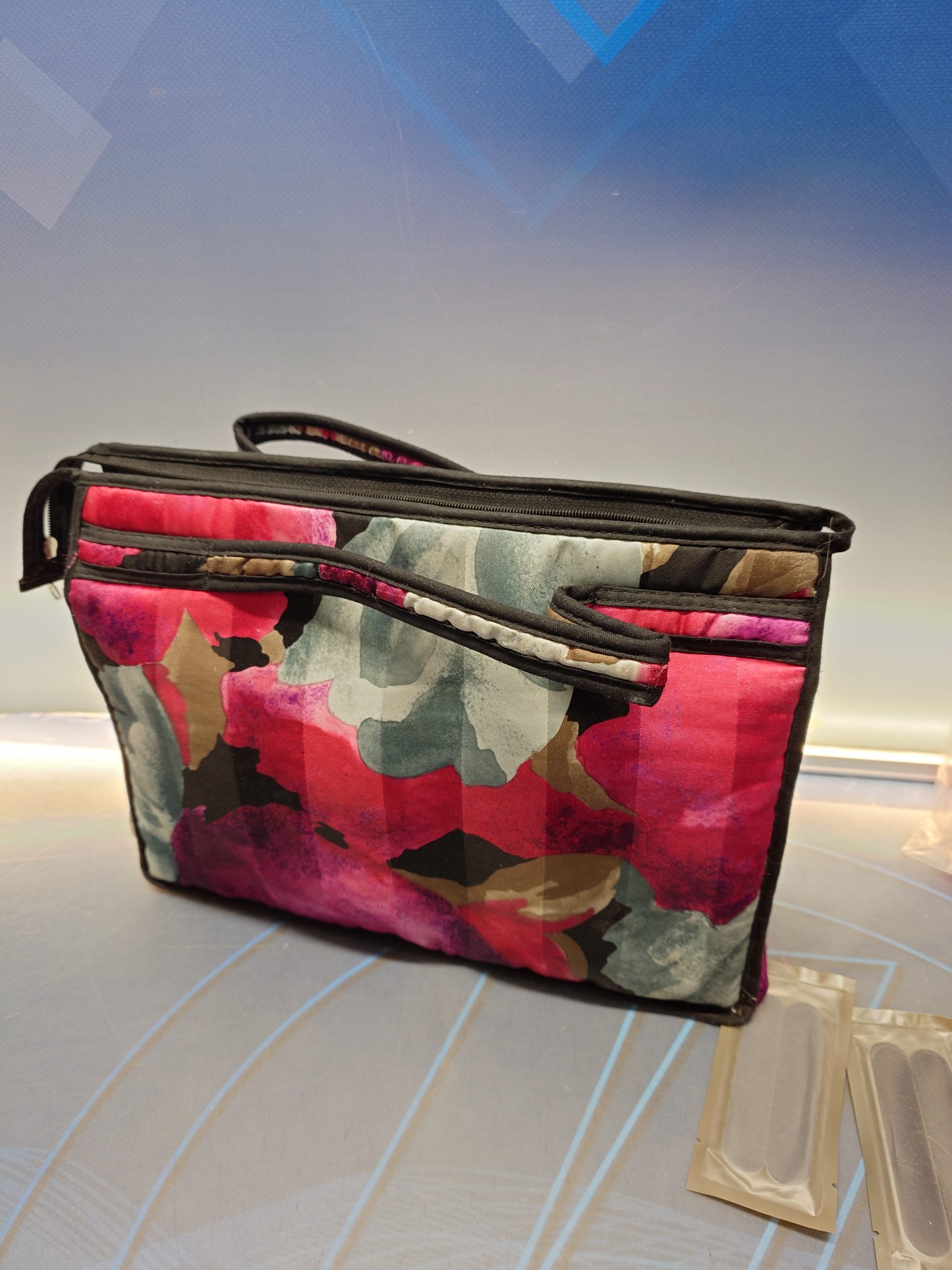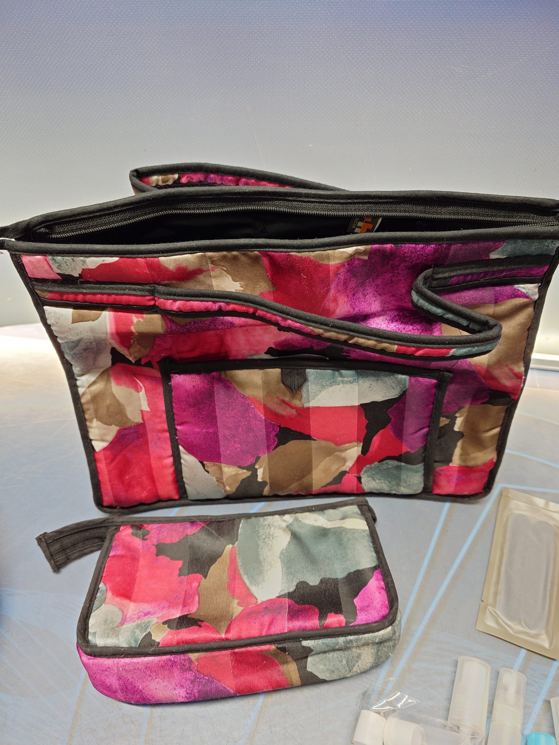 Bolso o neceser de viaje junto con material de viaje