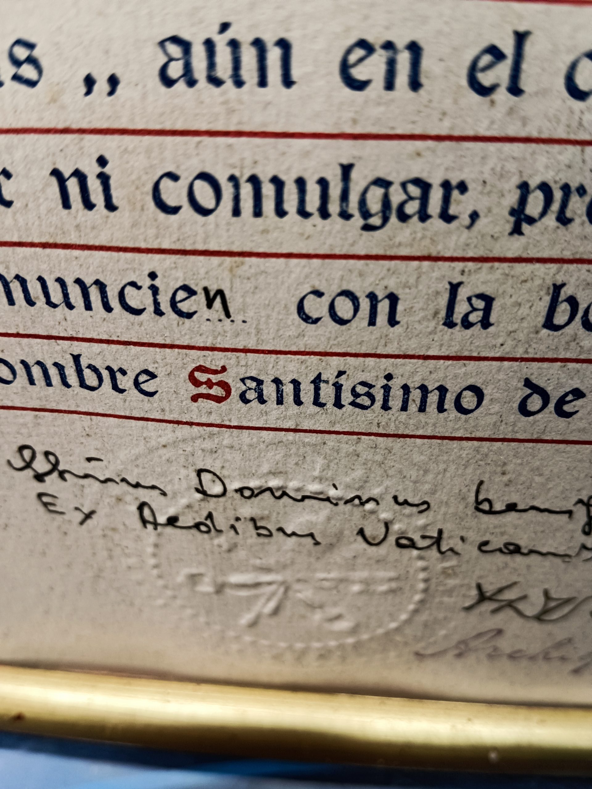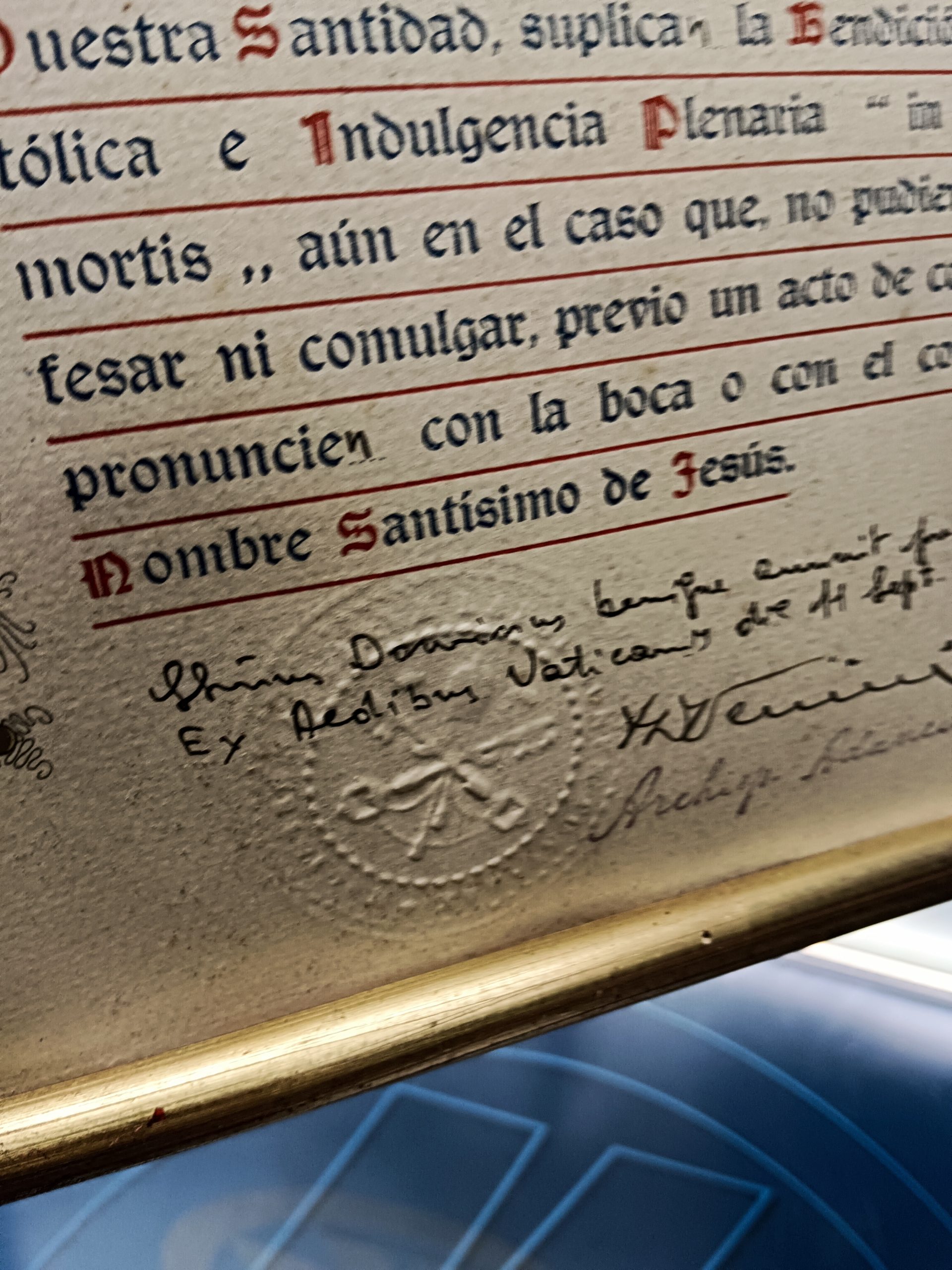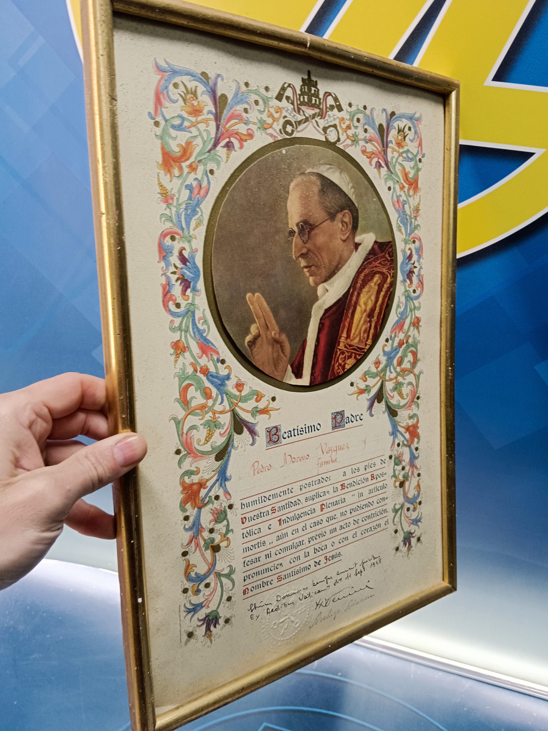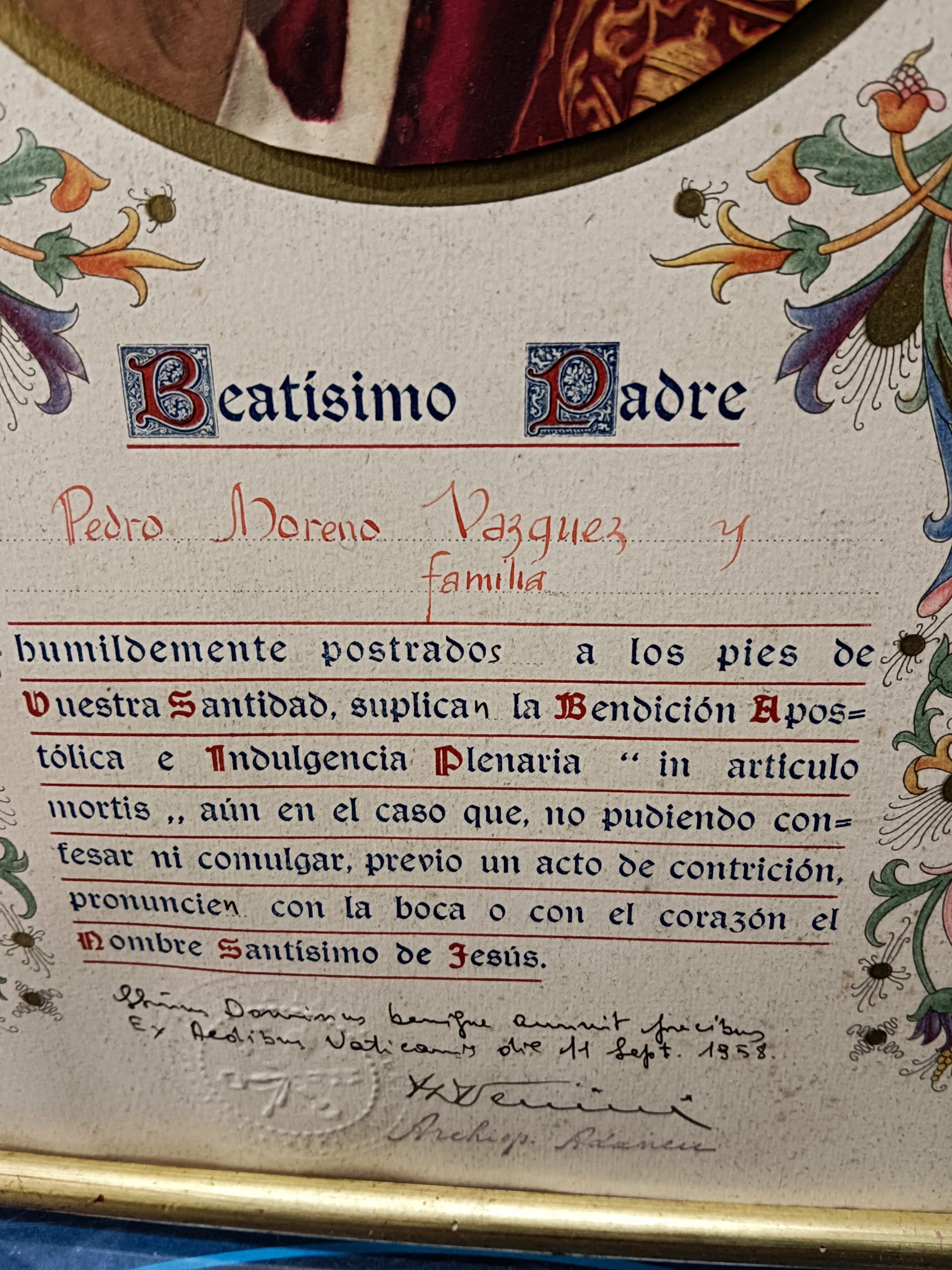 CUADRO , BEATISMO PADRE, BENDICIÓN APOSTÓLICA. 1958. SELLO VATICANO