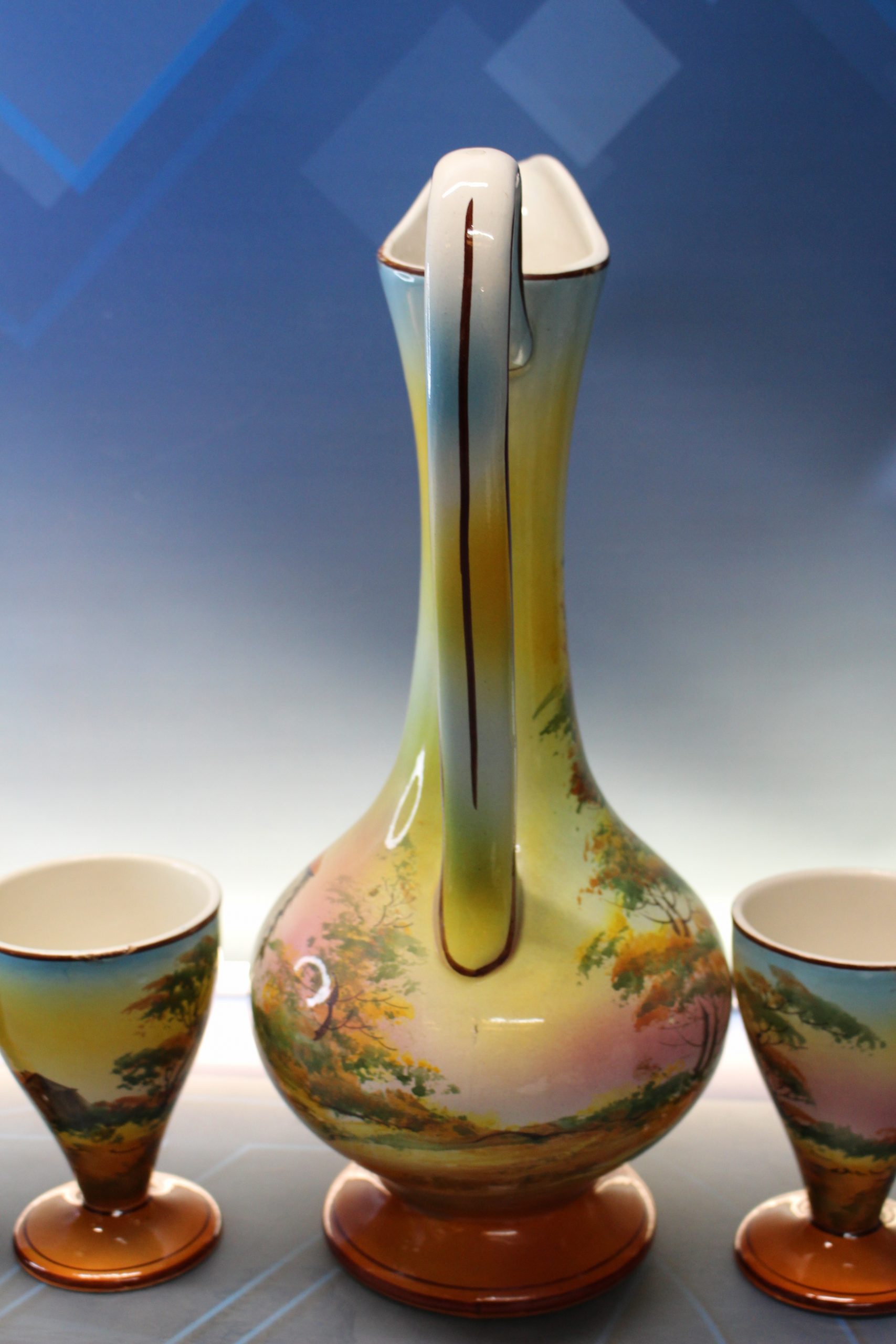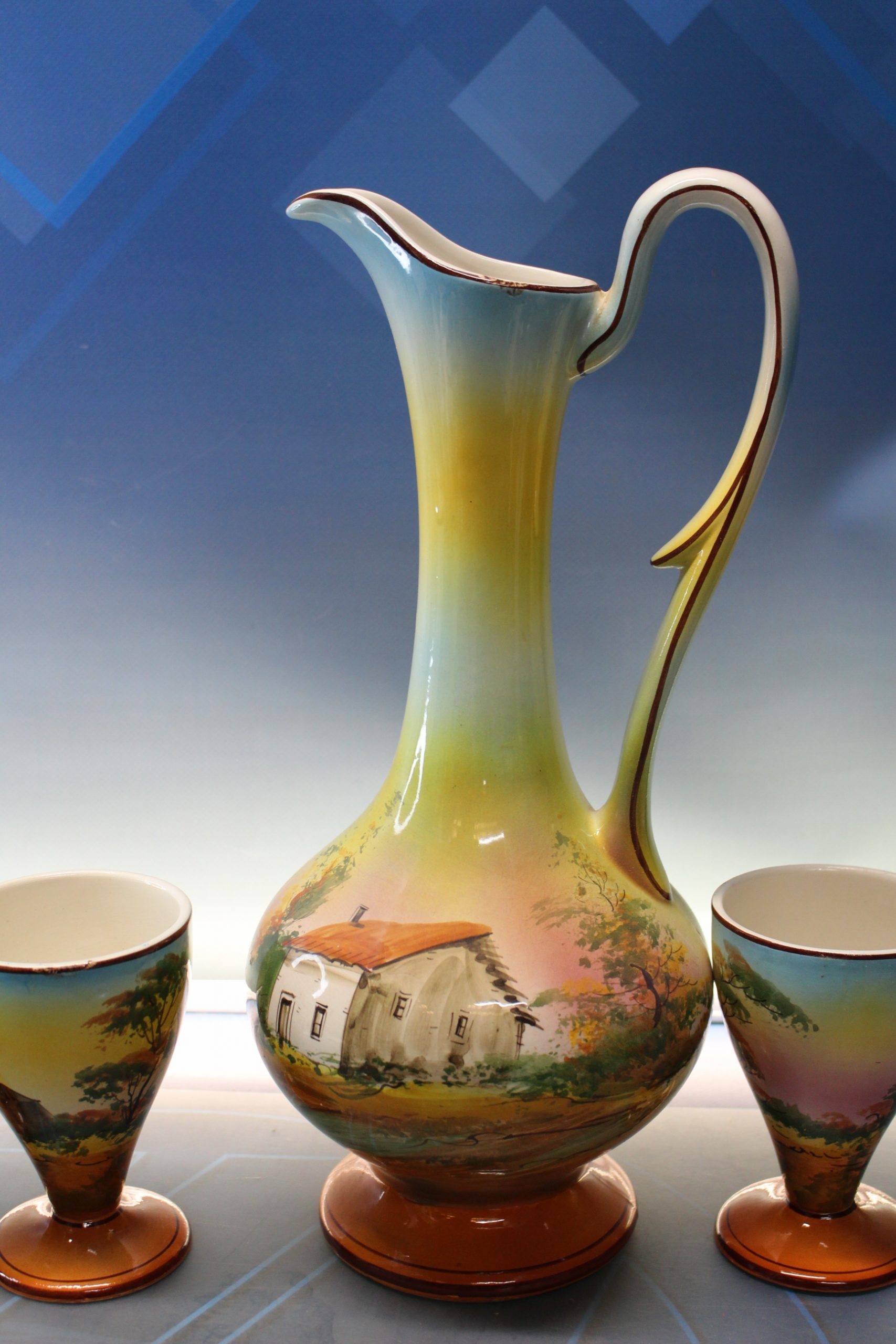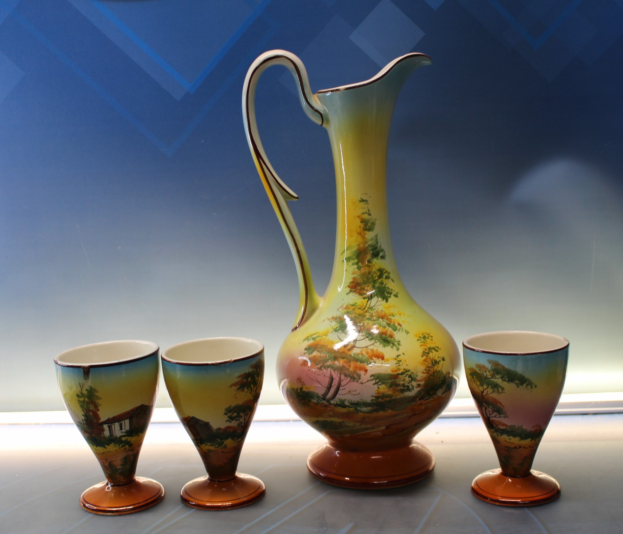 Jarra, jofaina y cuatro vasos de porcelana. Cerámica de Loucarte, Portugal.