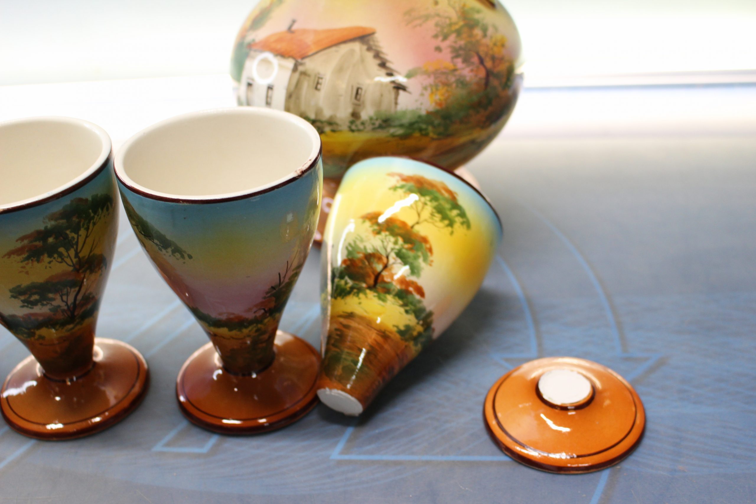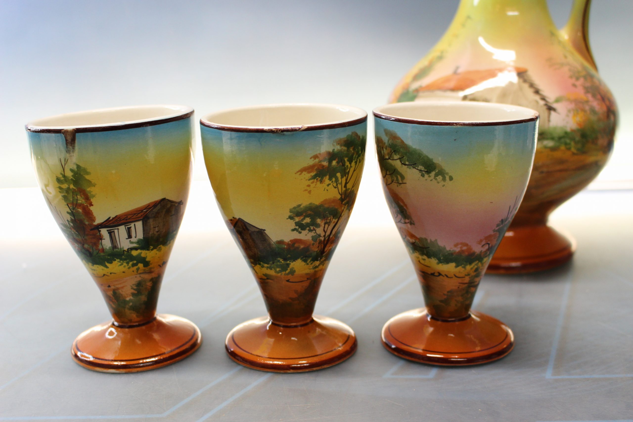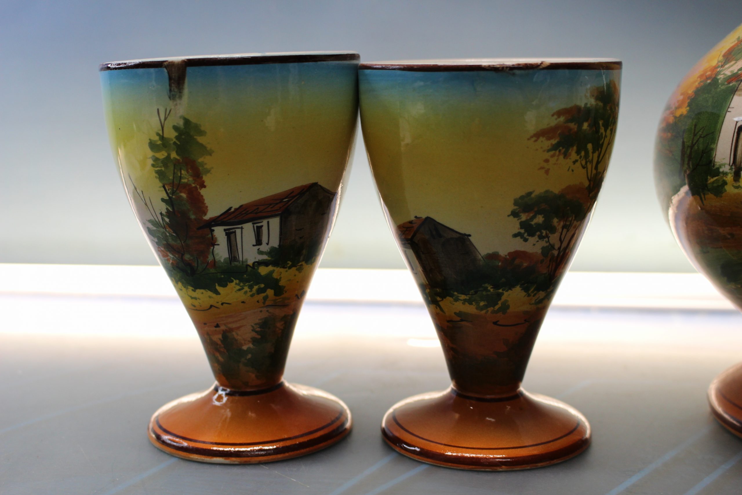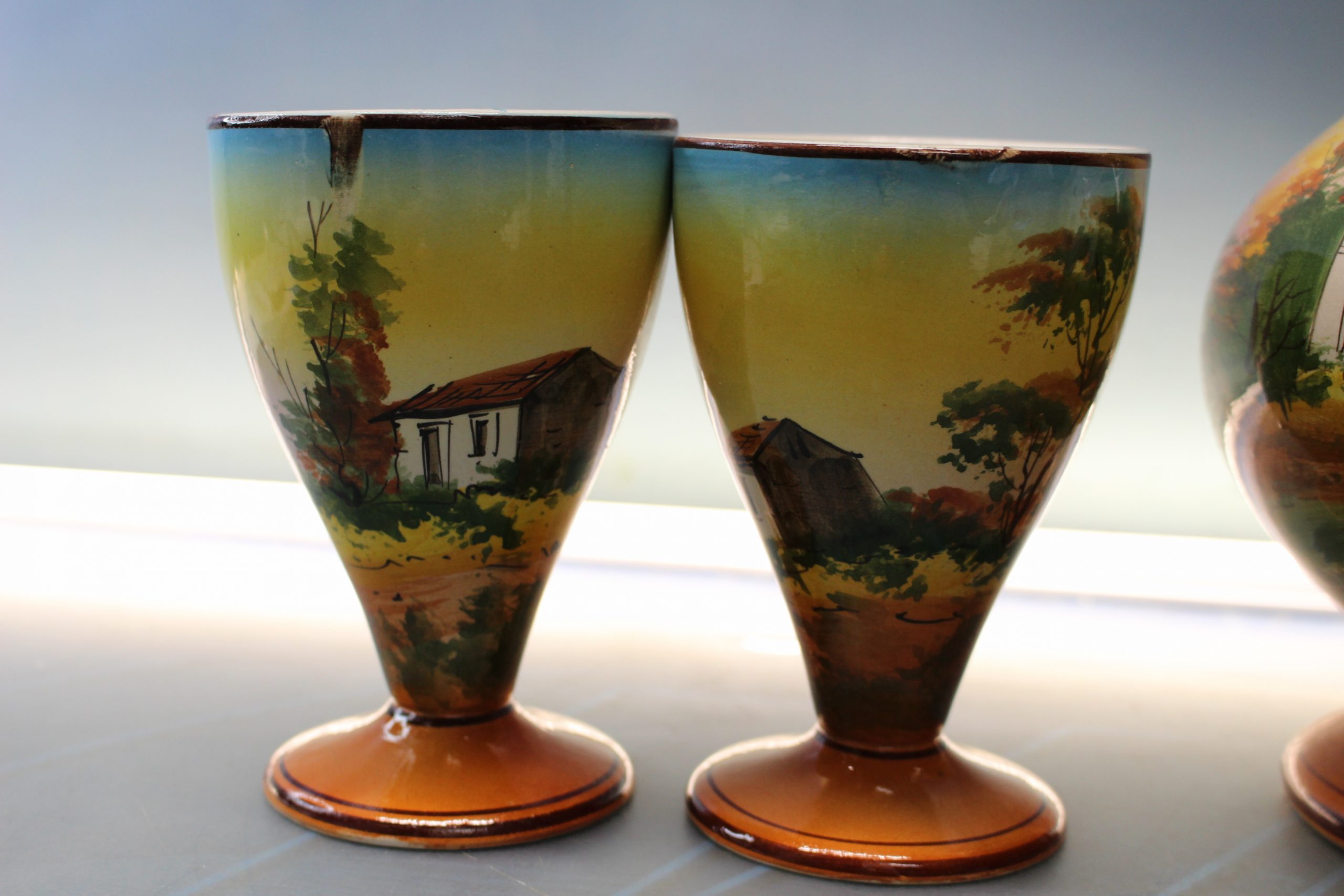 Pintado a mano. Filetes dorados. Se incluye el cuarto vaso que tiene el pie roto, por si gustan de repararlo.