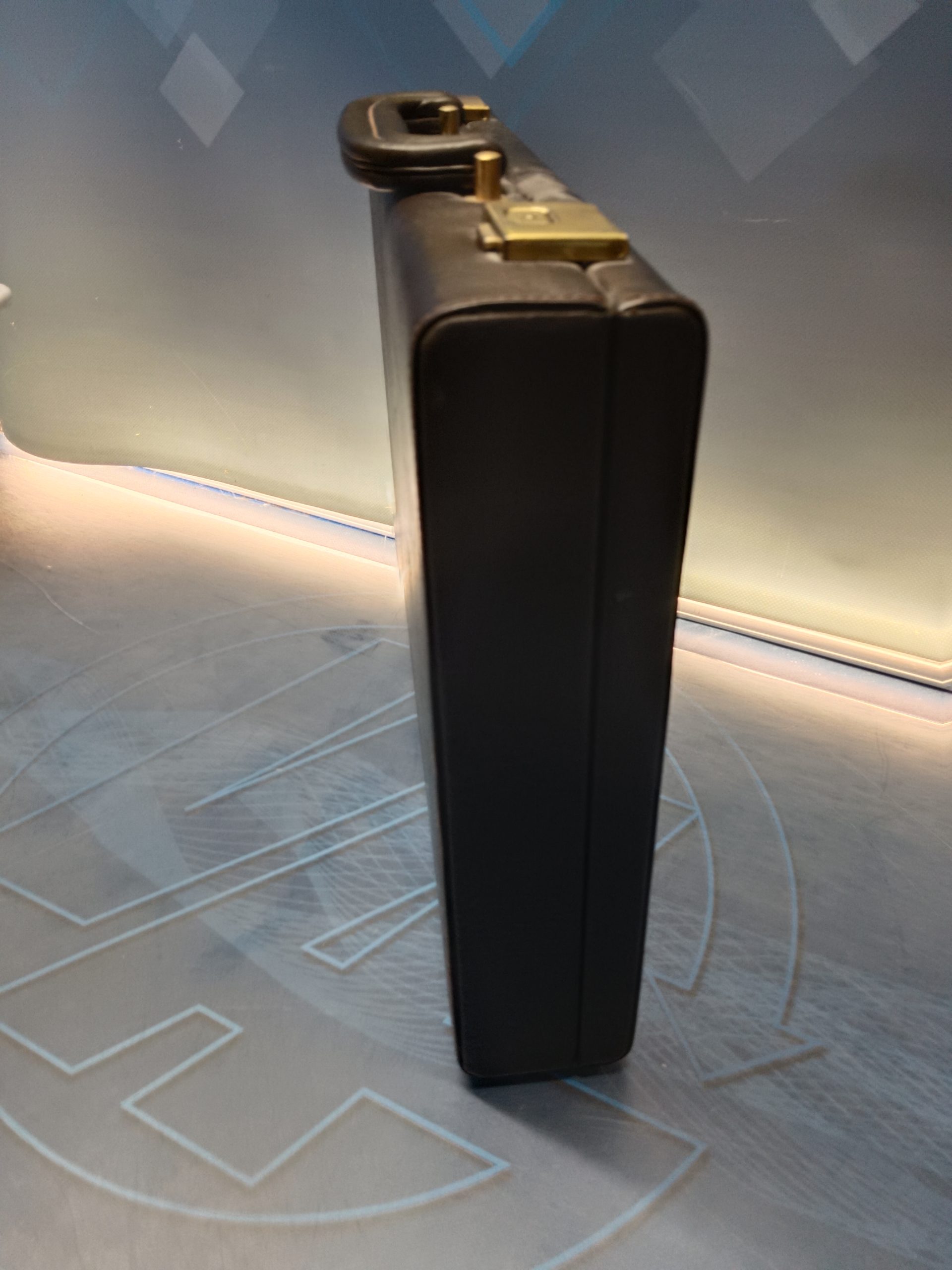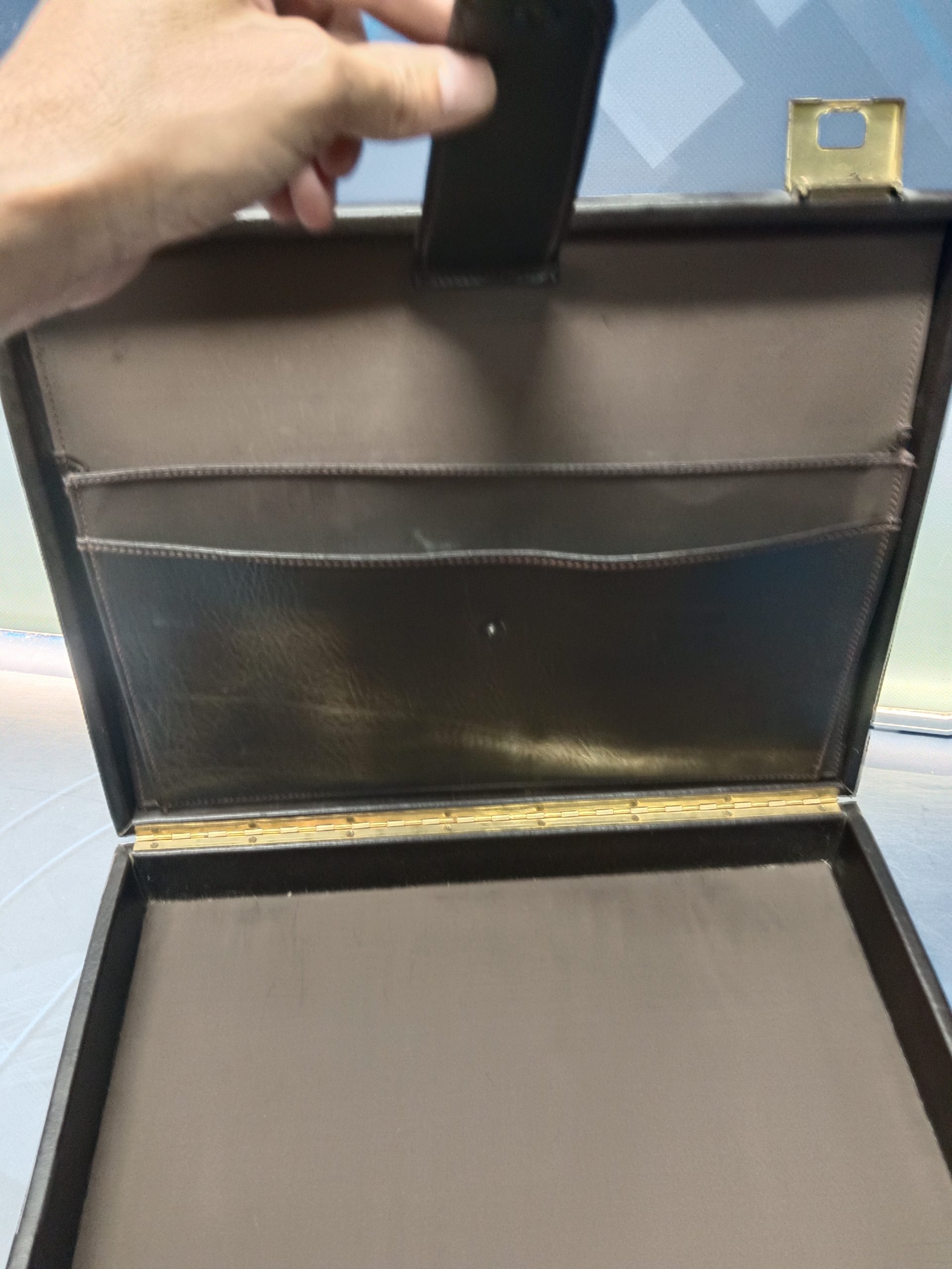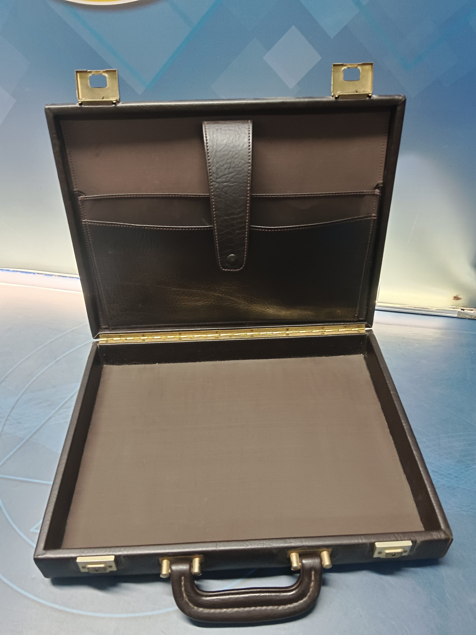 Color marrón oscuro o marrón chocolate, las medidas del maletín son 42 cm de ancho por 33 cm de alto por 7 cm de profundo. No tiene llaves.