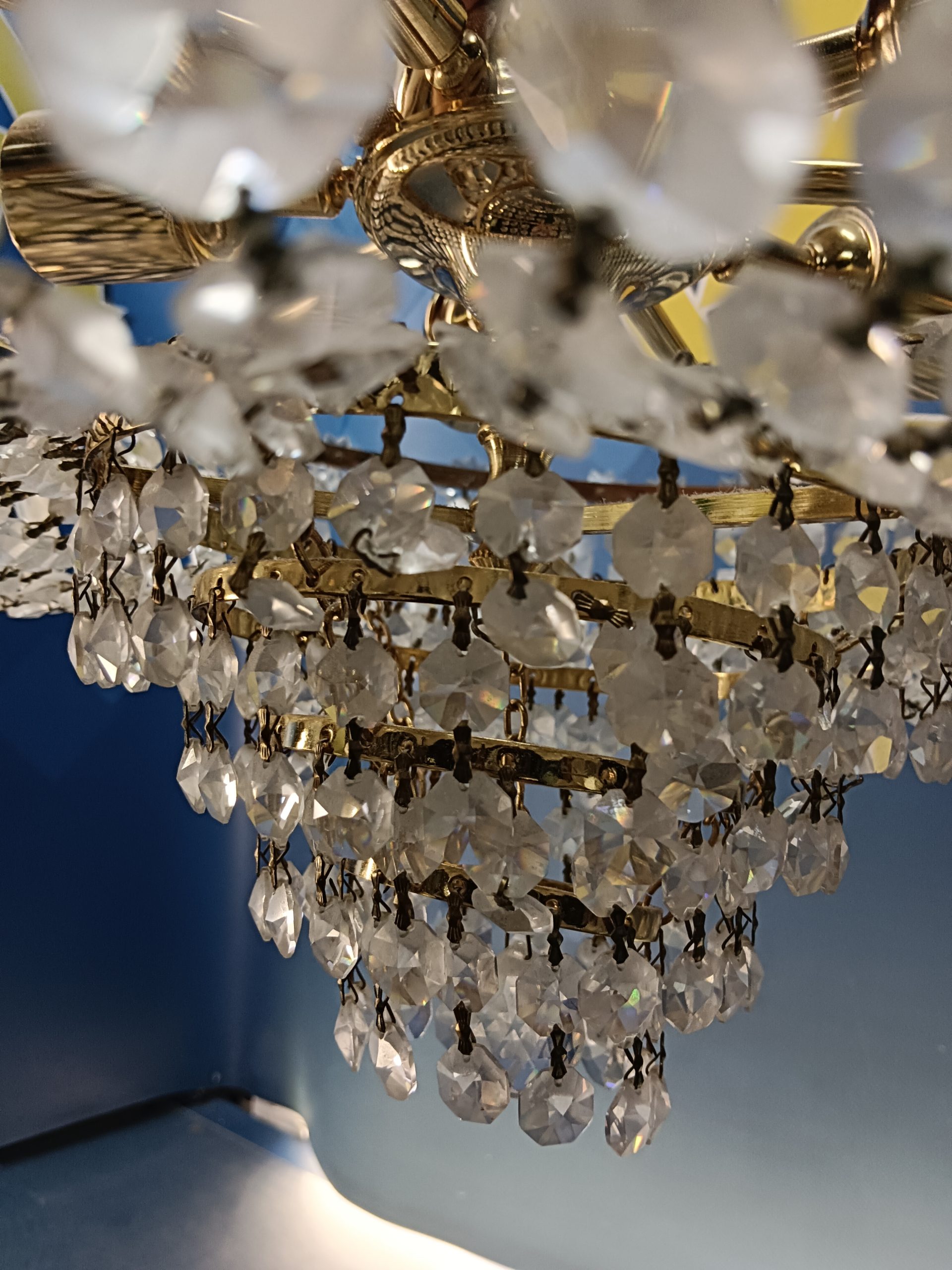 Preciosa Lámpara de latón y cristal , con colgantes, diametro 25 cm.