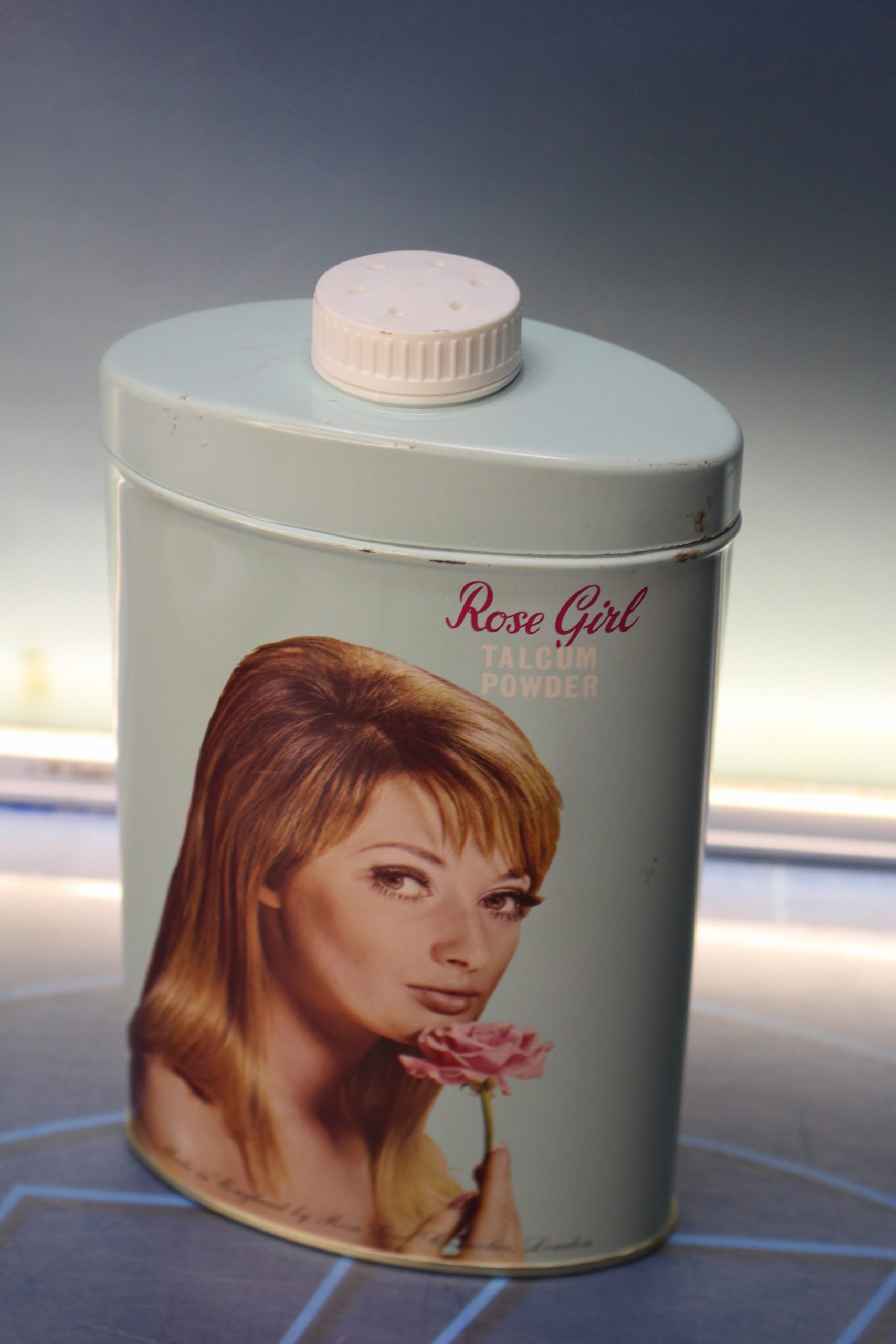 Rose Girl Talcum Powder. Antiguo bote de polvos de talco sin abrir.