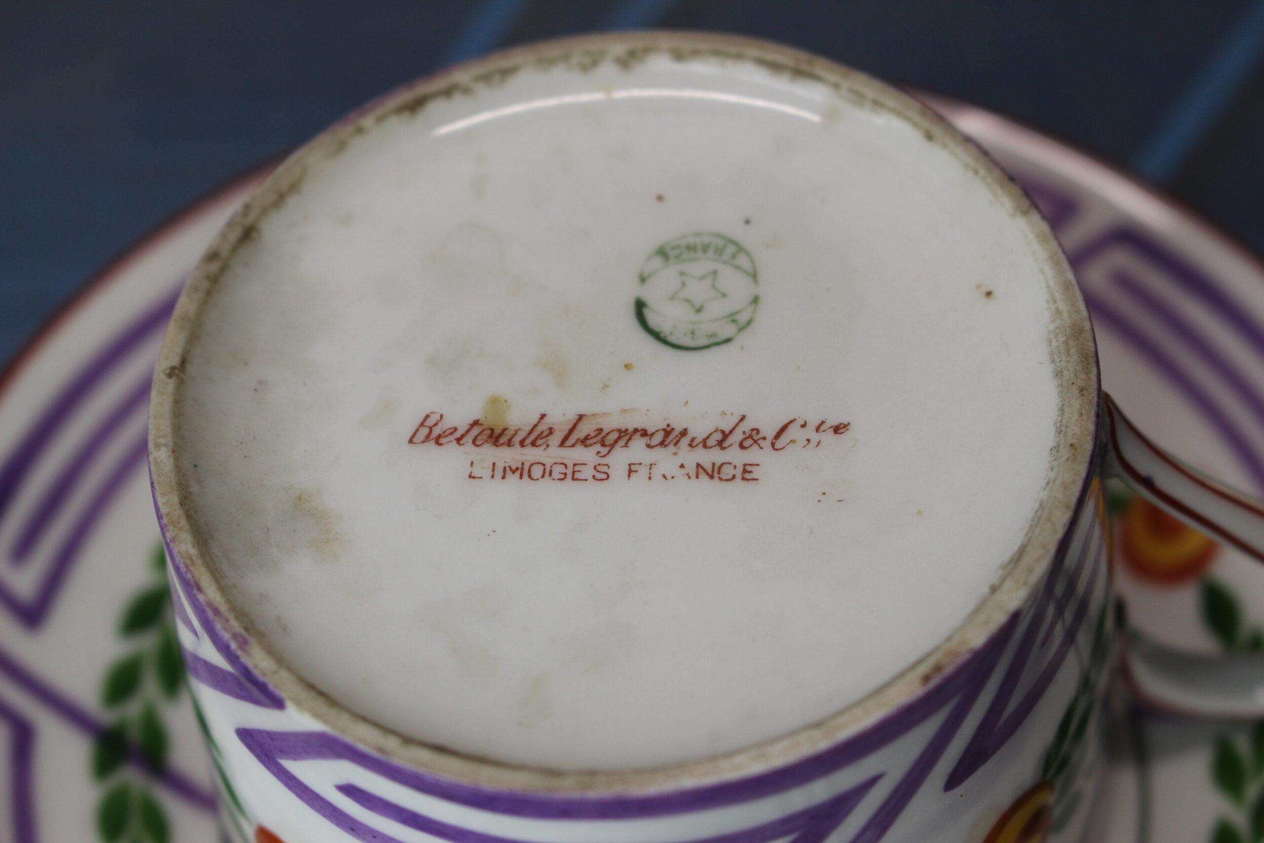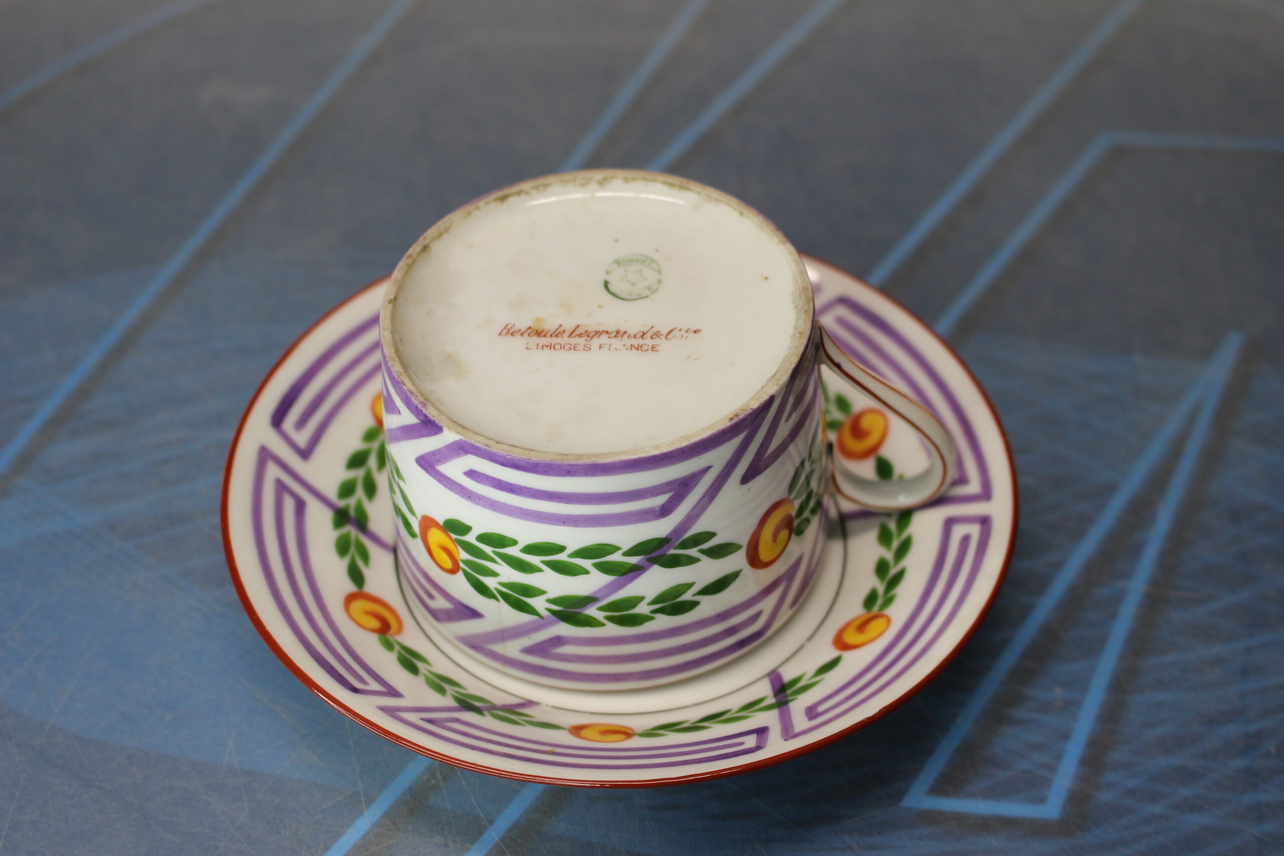 Taza y plato de porcelana Limoges, Betoule Legrand & Cie, Francia. 1904 – 1920.